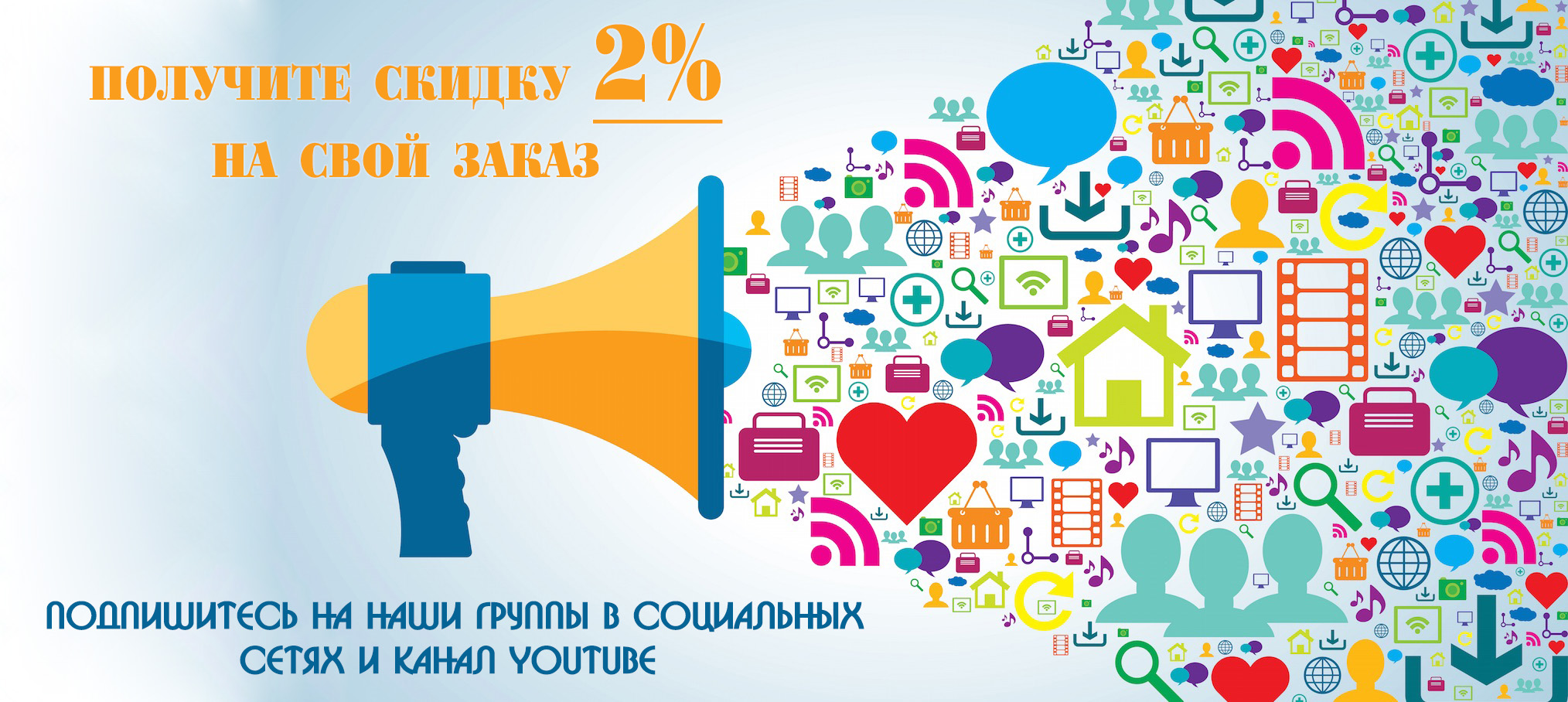 Вы активный пользователь социальных сетей? Тогда данная акция для Вас! Мы предоставляем скидку на любой заказ в размере 2%, если при оформлении заказа Вы сделаете следующие шаги:
