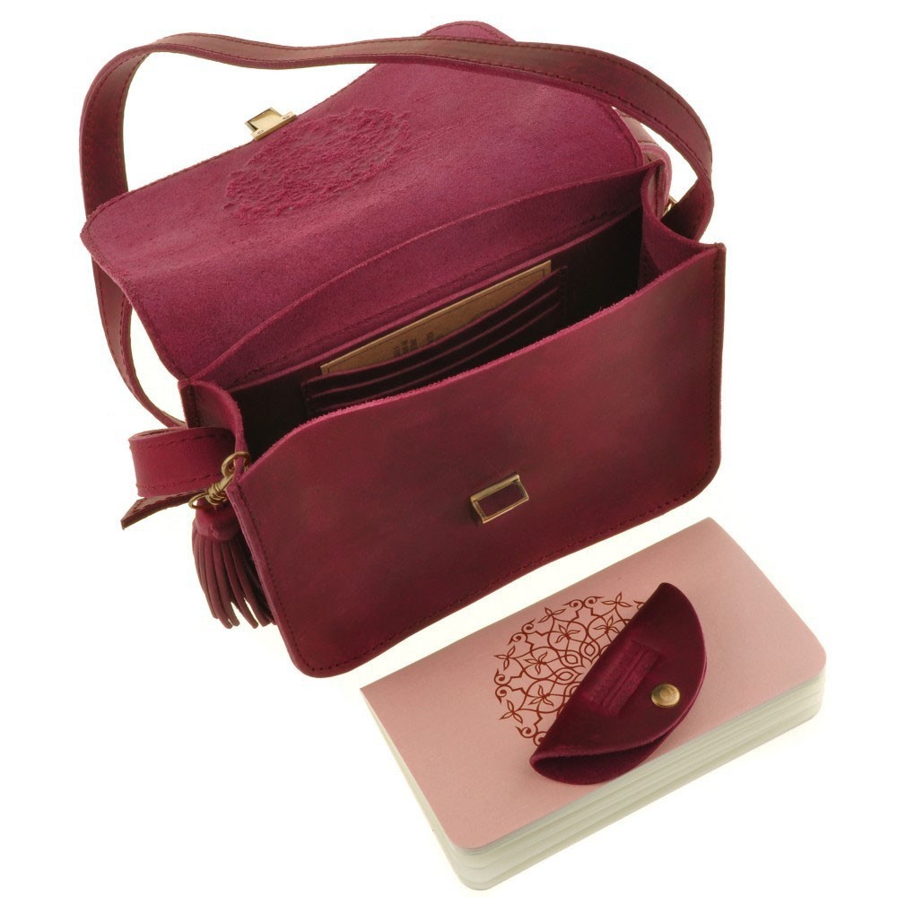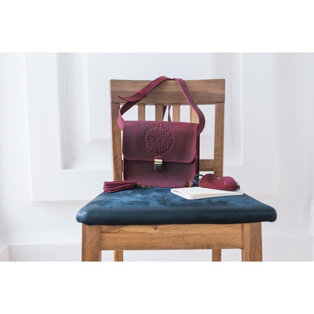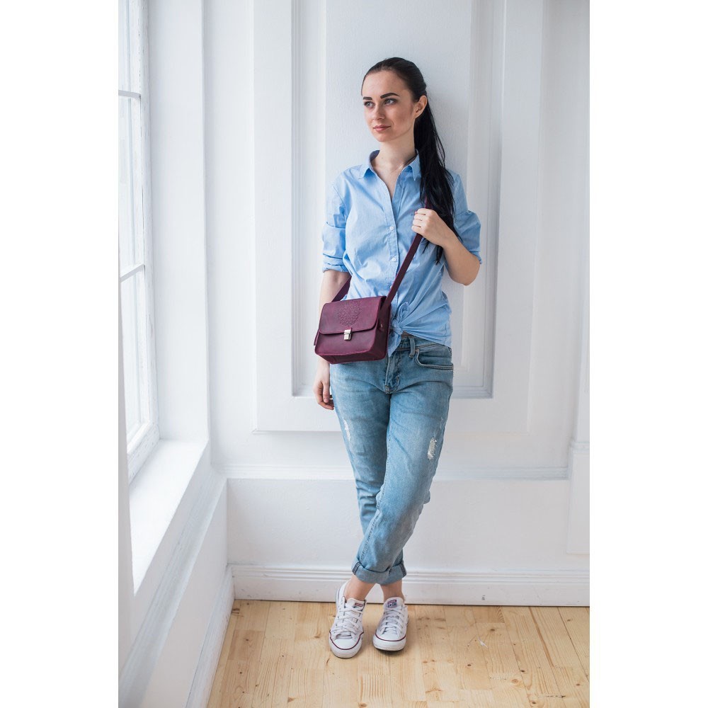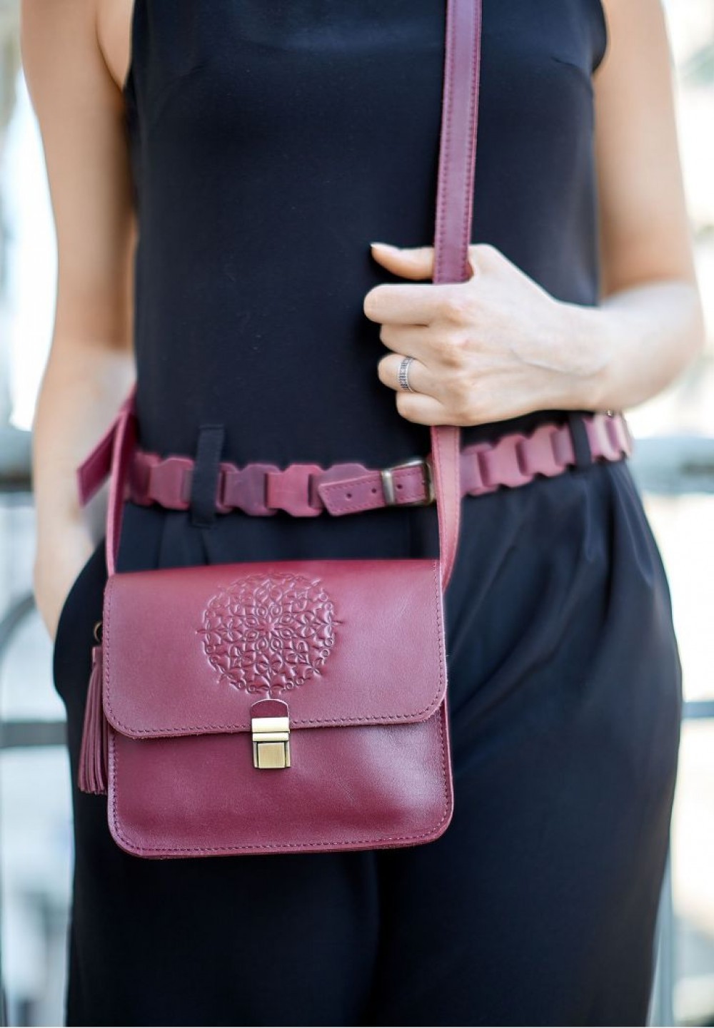 Отделы: 2 отделения и карман для карточек, ремешок регулируем. В конструкции изделия предусмотрено кольцо-люверс, к нему можно крепить кошелек либо ключи с помощью цепочки