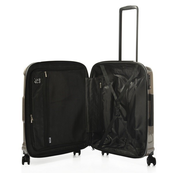Имеет внешнюю молнию с гидробарьером, внутренний разделитель на молнии, карманы различного объема, а также оснащен внутренними компрессионными шлейками для каждой половины чемодана отдельно