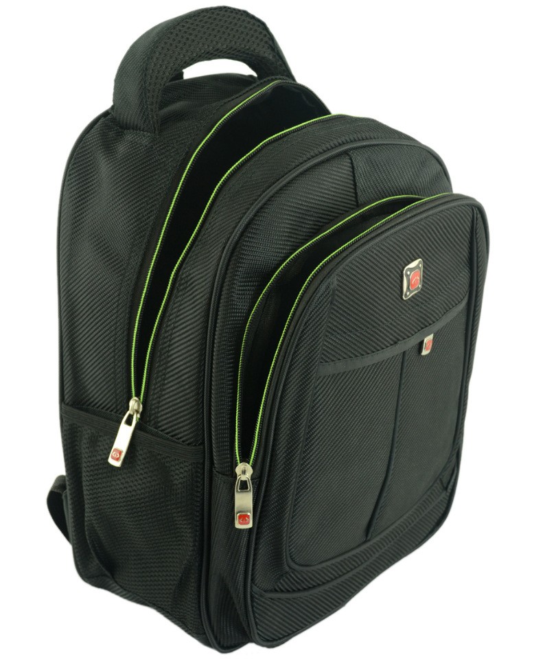 Деловой рюкзак из плотного полиэстера, черного цвета с зеленым кантом. Основное отделение закрывается на молнию. С лицевой стороны- 2 кармана на молнии. Боковые сеточные карманы. Регулируемые плечевые ремни.