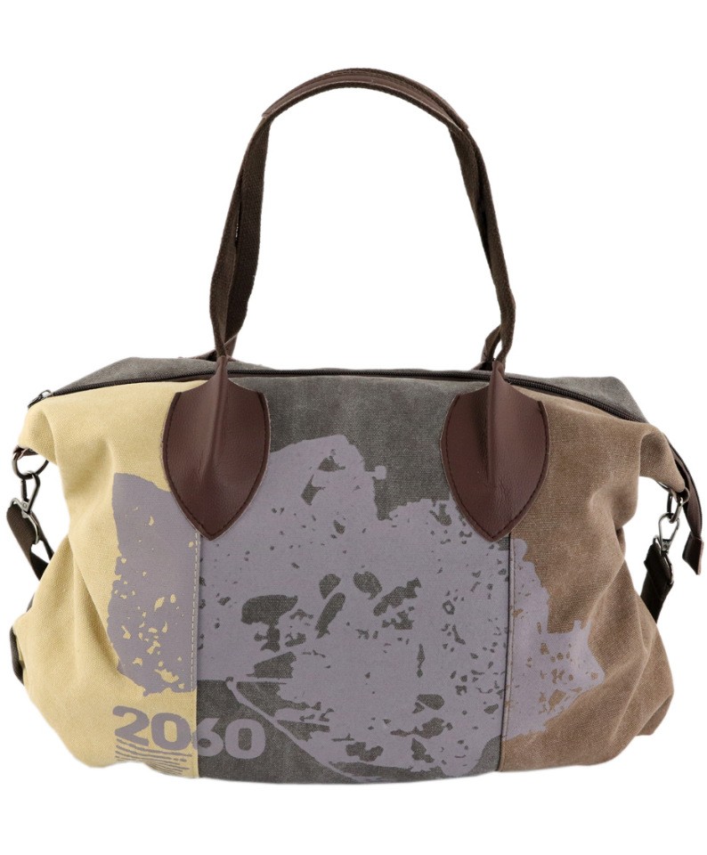 Сумка из холста на молнии, комбинирование цвета: коричневый, серый, желтый. Внутри: 3 кармана, 1- на молнии. С тыльной стороны- врезной карман на молнии. Ручки средней длины и съемный корсажный ремень.