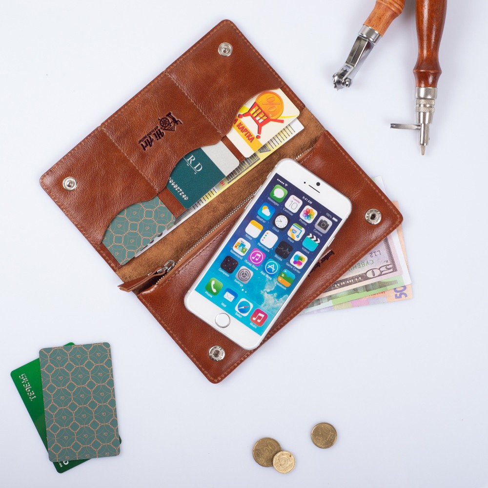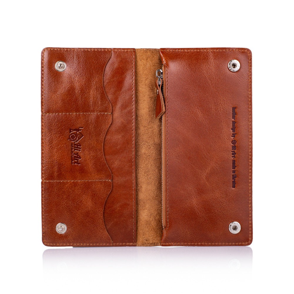 Эргономичный и стильный кошелек ручной работы из натуральной кожи на кнопках с художественным тиснением от HiArt , со всеми необходимыми отделами для купюр и мелочи. Будет отличным дополнением образа.