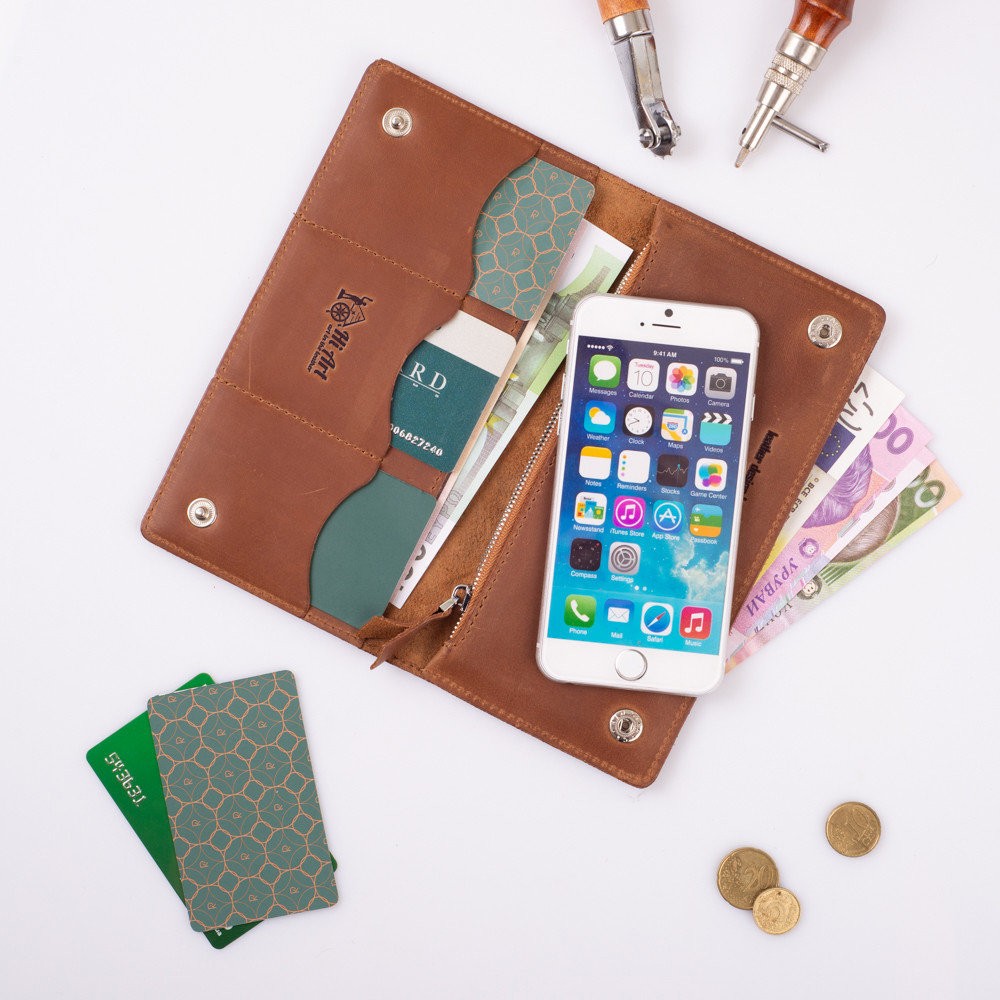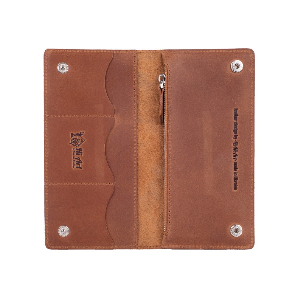 Эргономичный и стильный кошелек ручной работы из натуральной кожи на кнопках с художественным тиснением от HiArt , со всеми необходимыми отделами для купюр и мелочи. Будет отличным дополнением образа.