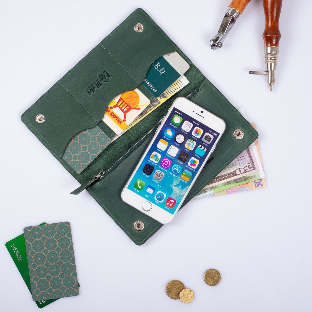 Количество отделов: 2 больших отдела для купюр и мобильного телефона; 3 отделения для карт, монетница