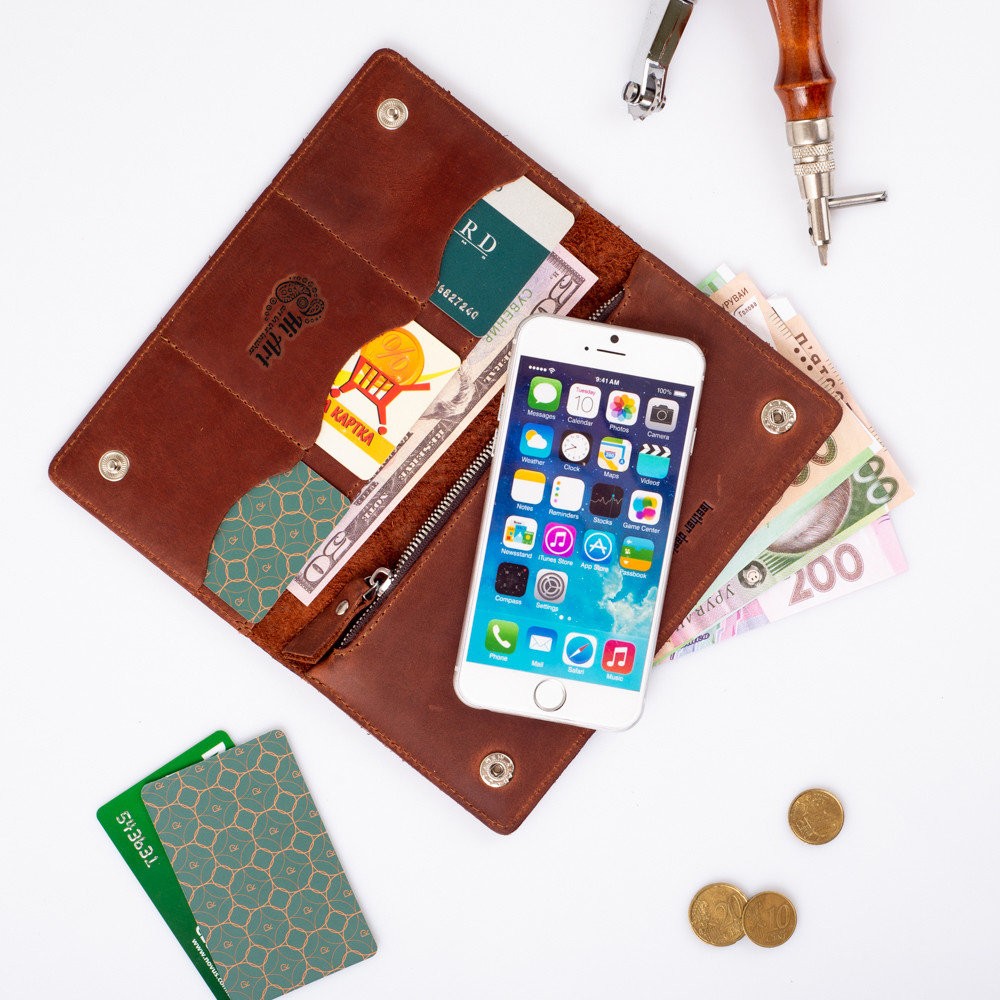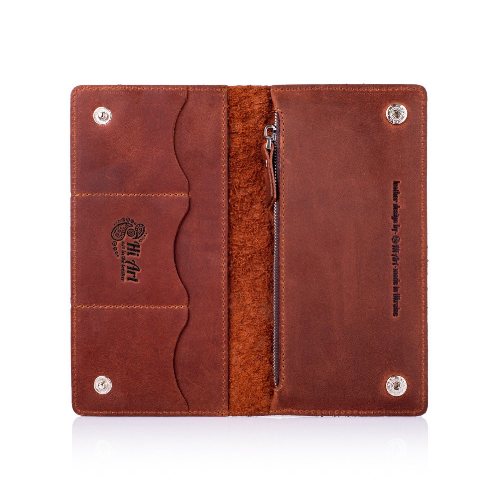Эргономичный и стильный кошелек ручной работы из натуральной кожи на кнопках с художественным тиснением от HiArt , со всеми необходимыми отделами для купюр и мелочи. Будет отличным дополнением образа.