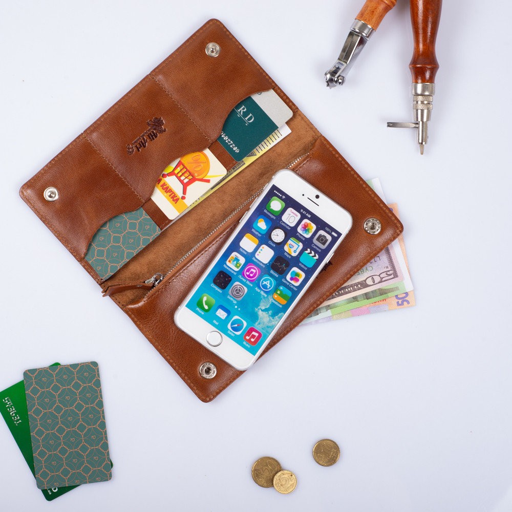 Количество отделов: 2 больших отдела для купюр и мобильного телефона; 3 отделения для карт, монетница