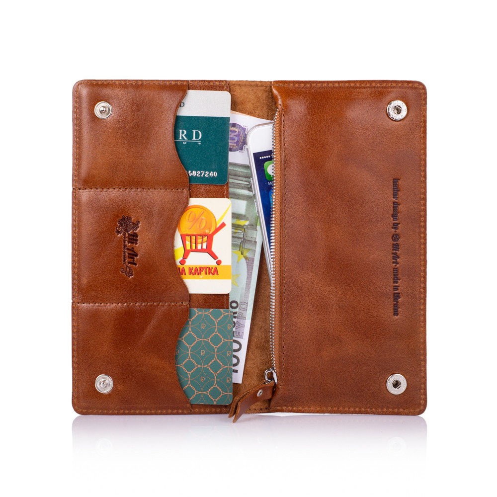 Эргономичный и стильный кошелек ручной работы из натуральной кожи на кнопках с художественным тиснением от HiArt , со всеми необходимыми отделами для купюр и мелочи. Будет отличным дополнением образа.