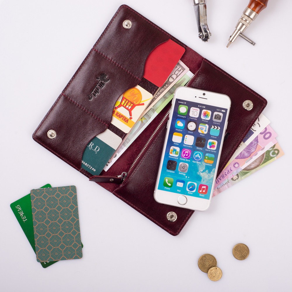 Количество отделов: 2 больших отдела для купюр и мобильного телефона; 3 отделения для карт, монетница