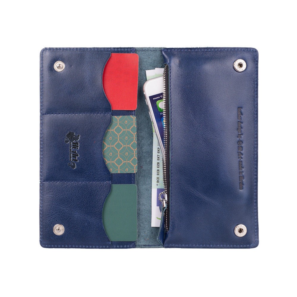 Количество отделов: 2 больших отдела для купюр и мобильного телефона; 3 отделения для карт, монетница