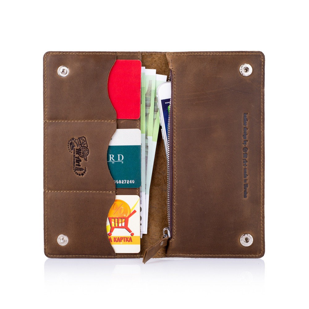 Эргономичный и стильный кошелек ручной работы из натуральной кожи на кнопках с художественным тиснением от HiArt , со всеми необходимыми отделами для купюр и мелочи. Будет отличным дополнением образа.