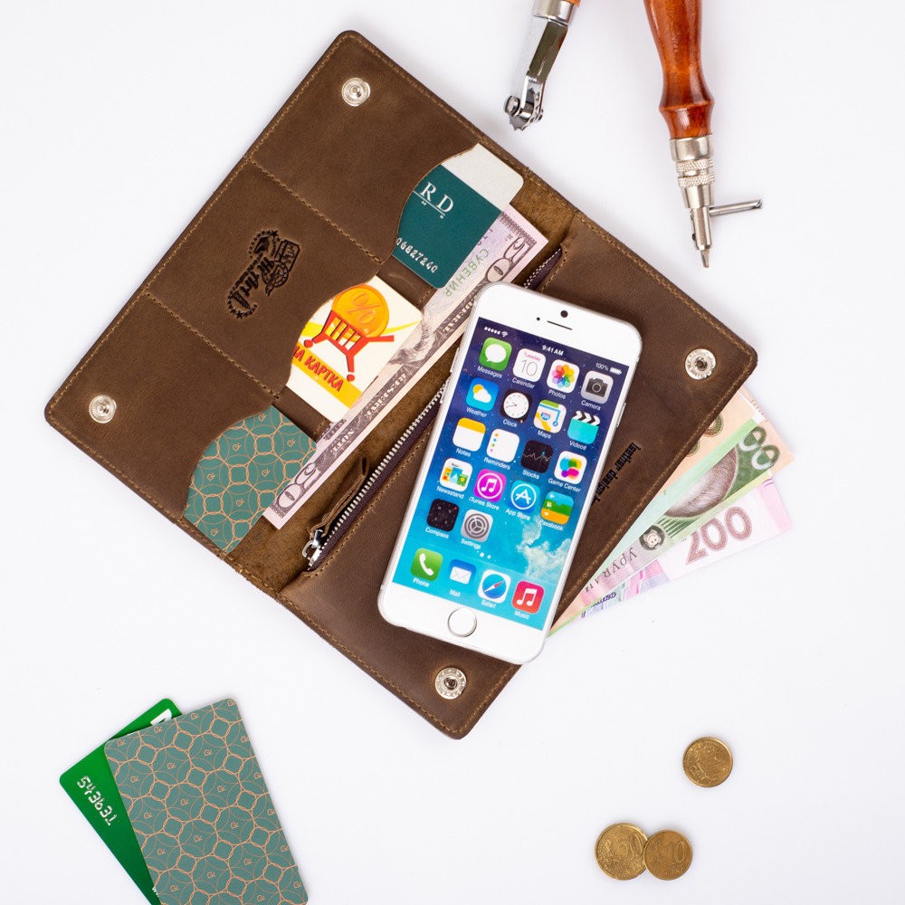 Количество отделов: 2 больших отдела для купюр и мобильного телефона; 3 отделения для карт, монетница