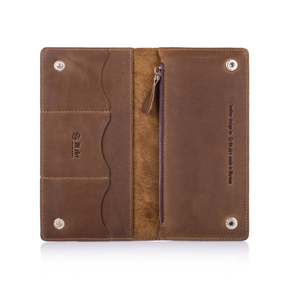 Эргономичный и стильный кошелек ручной работы из натуральной кожи на кнопках с художественным тиснением от HiArt , со всеми необходимыми отделами для купюр и мелочи. Будет отличным дополнением образа.