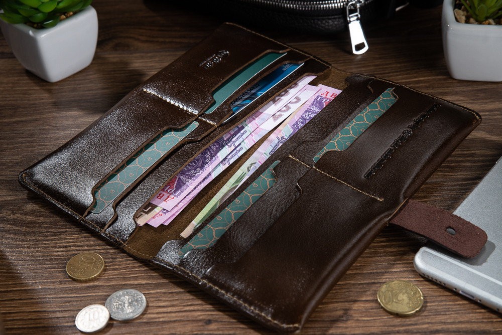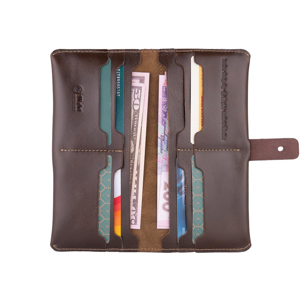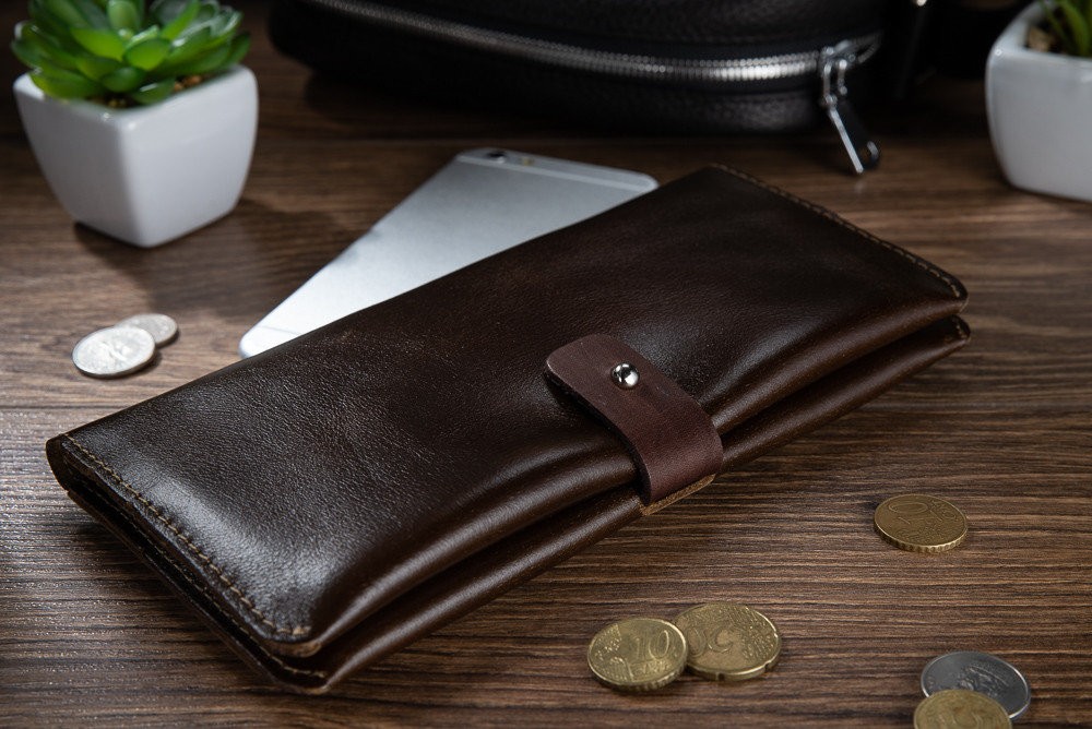 Эргономичный и стильный кошелек ручной работы из натуральной кожи на кнопках с художественным тиснением от HiArt , со всеми необходимыми отделами для купюр и мелочи. Будет отличным дополнением образа.