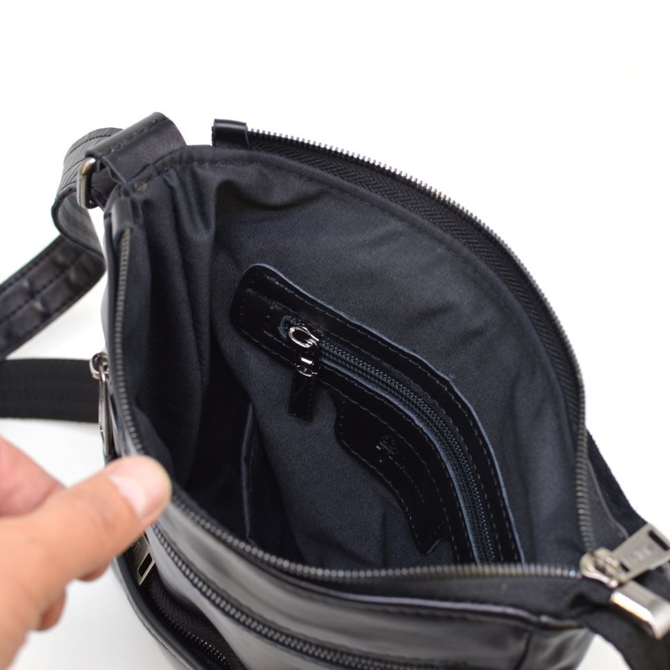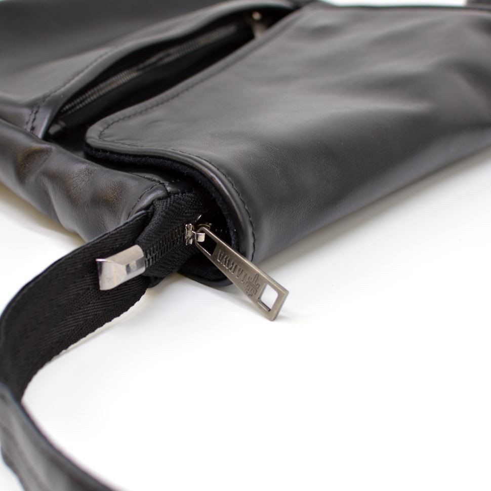 Количество отделений: 1 вместительное отделение, застегивающееся на молнию, и сверху накрывается кожаным клапаном, косой формы, с магнитной кнопкой. Внутри есть карманы: 2 накладных открытых для телефона и портмоне, и 1 врезной на молнии. Спереди аксессуара располагаются два кармана с молниями, один из которых прячется под клапаном, а второй имеет косую форму. Сзади есть врезной карман на молнии.
