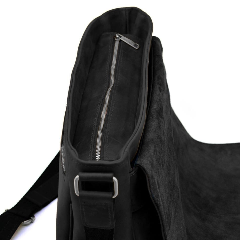 Количество отделов: одно вместительное отделение, внутри которого располагается мягкий отсек для планшета с хлястиком на липучке, а также три кармана: один вместительный врезной на молнии и два открытых для портмоне и телефона. В основном отделении может поместиться ноутбук до 14" и документы формата А. Снаружи на лицевой стороне под клапаном есть большой плоский врезной карман с молнией. Снаружи на задней стороне - также врезной карман на молнии.