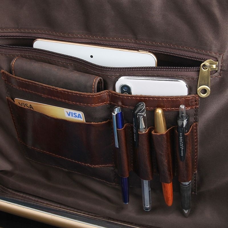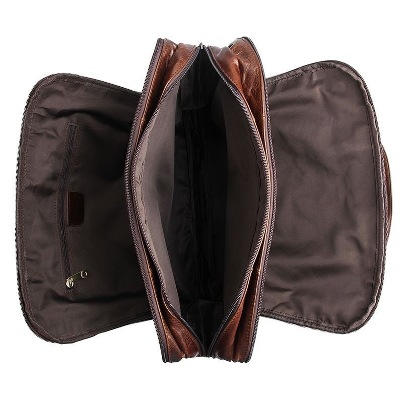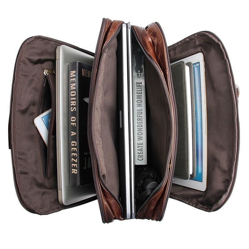 Количество отделов: 3 отделения, которые закрываются замками-молниями. Первое отделение (которое ближе к передней стенке изделия) оснащено многофункциональным органайзером для хранения ручек, карандашей, блокнота или портмоне и смартфона. Для каждой из этих полезных вещичек выделен специальный карманчик. Другое отделение предназначено для хранения как ноутбука(до 19"), так и множества документов. Третье отделение вместительное и туда можно разместить разные бумаги, журналы, книги.В этом отделении есть также горизонтальный врезной карманчик на молнии. В каждое из отделений сумки можно положить любой гаджет: электронную книгу, планшет, смартфон и т.д. На передней стенке портфеля есть 2 кармана горизонтально размещенных друг над другом. Нижний застегивается на молнию, а верхний имеет накладной клапан на двух кнопках-магнитах. Оба кармана врезного типа. На задней стенке есть еще один карман на молнии. он тоже очень вместительный.