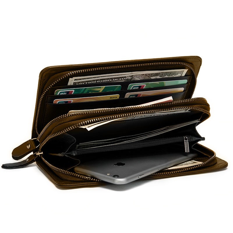 Количество отделов: 2 основных отделения. Внутри отсеки для купюр, слоты для кредитных и дисконтных карт, карман для смартфона, монетница на молнии. Снаружи на тыльной стороне предусмотрен съемный запястный ремешок.
