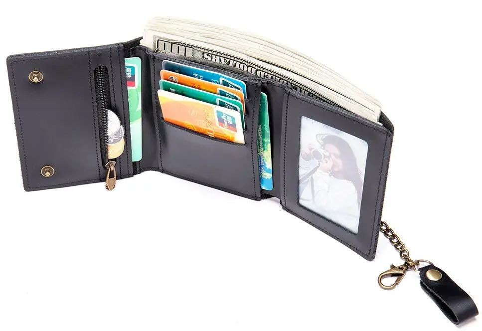 Количество отделов: 1 основное отделение для купюр; 5 слотов для кредиток (1 из них под пленкой); 2 открытых кармана; кармашек для монет на молнии;