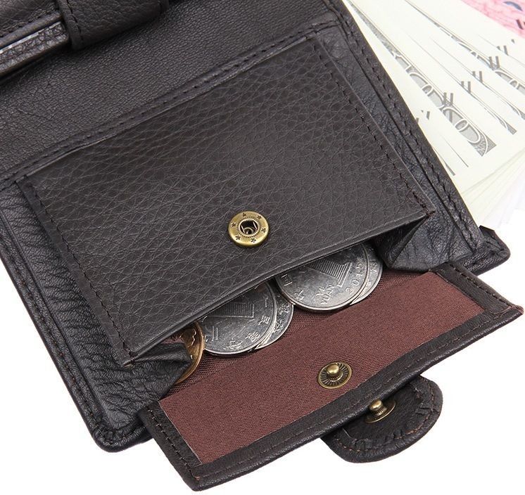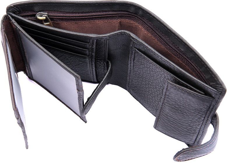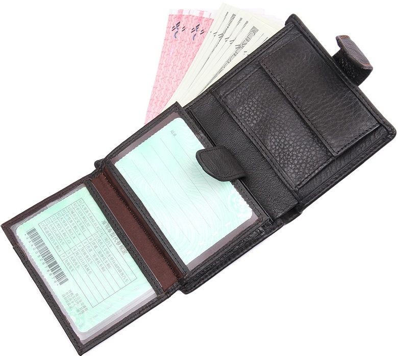 Количество отделов: 1 отдел для купюр, 1 отдел на молнии, монетница на кнопке, 7 отделений для пластиковых карточек, 2 небольших отделения для документов под прозрачной пленкой, 3 потайных кармана