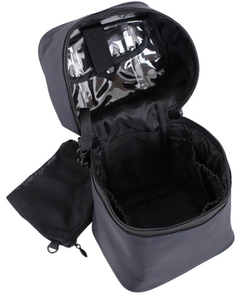 Внутри: кармашек из ПВХ на кнопке, 1 сеточный карман, 6 кармашков на резинке и сеточный съемный карман на молнии.