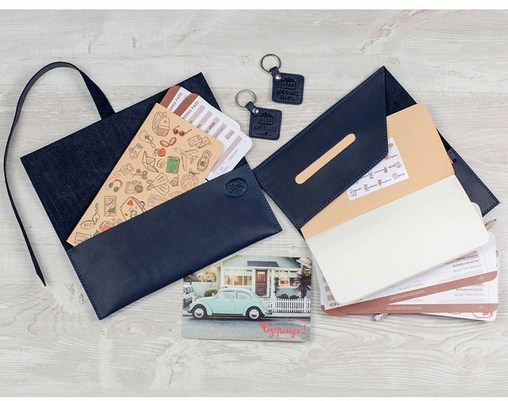 Размеры: тревел-кейс с хлястиком (12х24 см), тревел-кейс (13х21 см), 2 брелка (4х4 см), открытка (10х15 см)