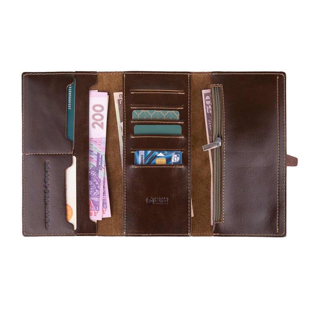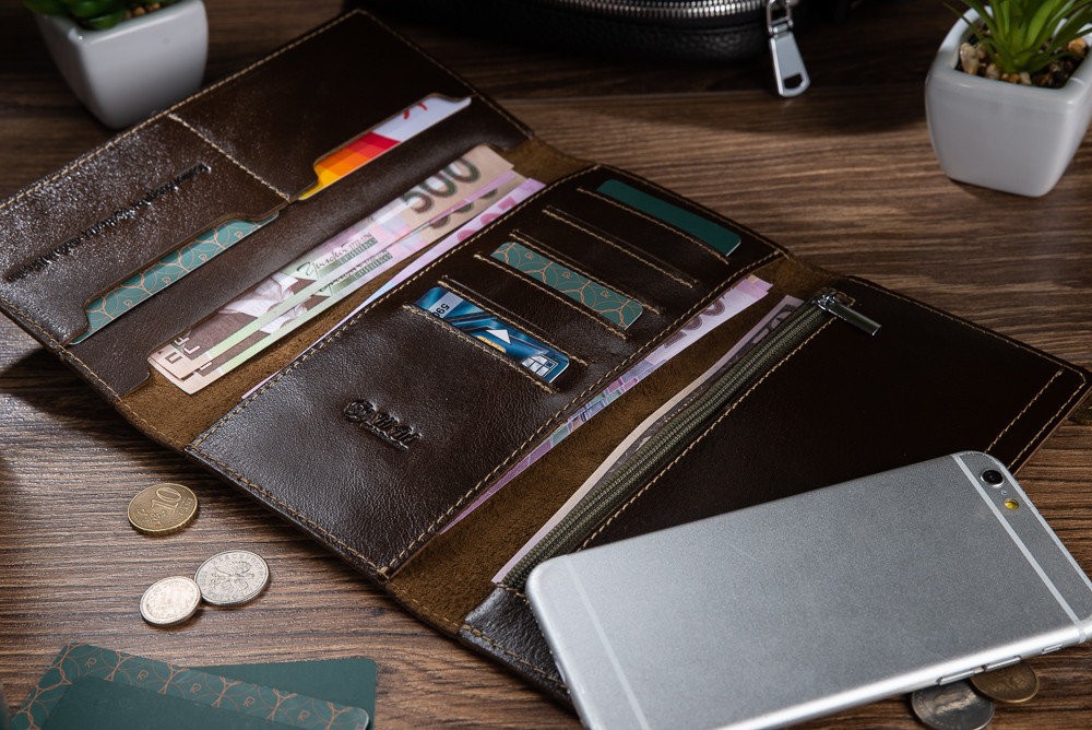 Количество отделов: 2 больших отдела для купюр и мобильного телефона; 8 отделений для карт, монетница на молнии. Каждый карман выполнен с подкладом (карты не проваливаются).