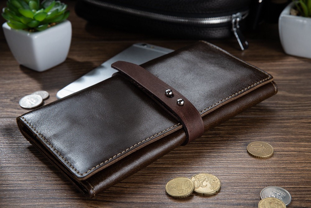 Эргономичный и стильный кошелек ручной работы из натуральной кожи на кнопках с художественным тиснением от HiArt , со всеми необходимыми отделами для купюр и мелочи. Будет отличным дополнением образа.