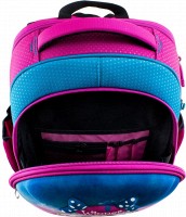 - Отделения: Основное большое отделение у спины, с тканевыми разделителями, для школьных принадлежностей. В переднем отделении место для тетрадей и органайзер для письменных принадлежностей. Два кармана на липучке по бокам.