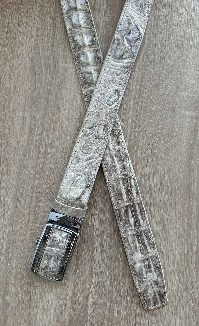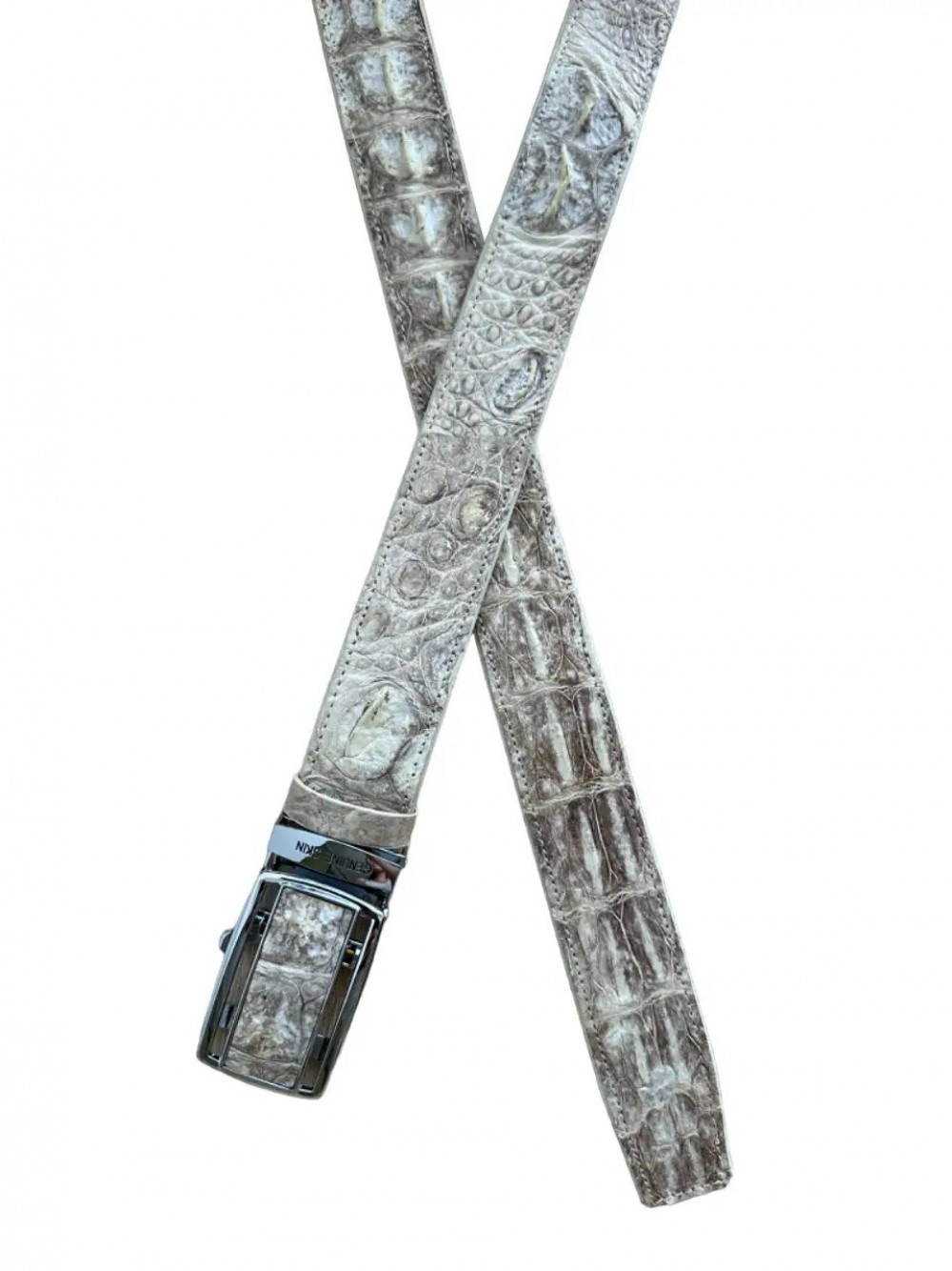 Ремень мужской из кожи крокодила, ремень укомплектован автоматической пряжкой со вставкой из кожи крокодила под цвет изделия. Ремень выполнен на телячьем основании, прошит и проклеен, что добавляет ему износостойкости при использовании.