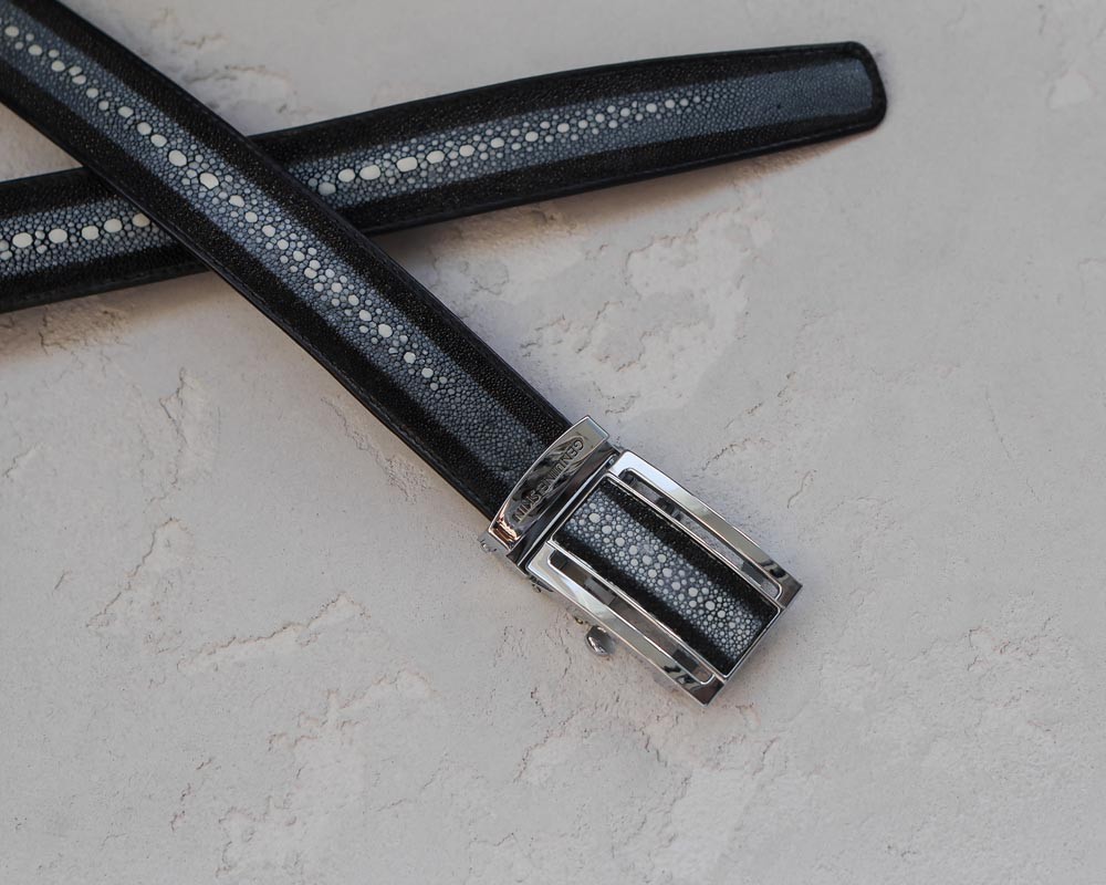 В качестве основного украшения ремня на лицевой поверхности полотна ремня пропущена спинная часть (в виде белой полосы) спинка шкурки морского ската. Ремень выполнен на основании телячьей кожи, прошит и проклеен по всей длине