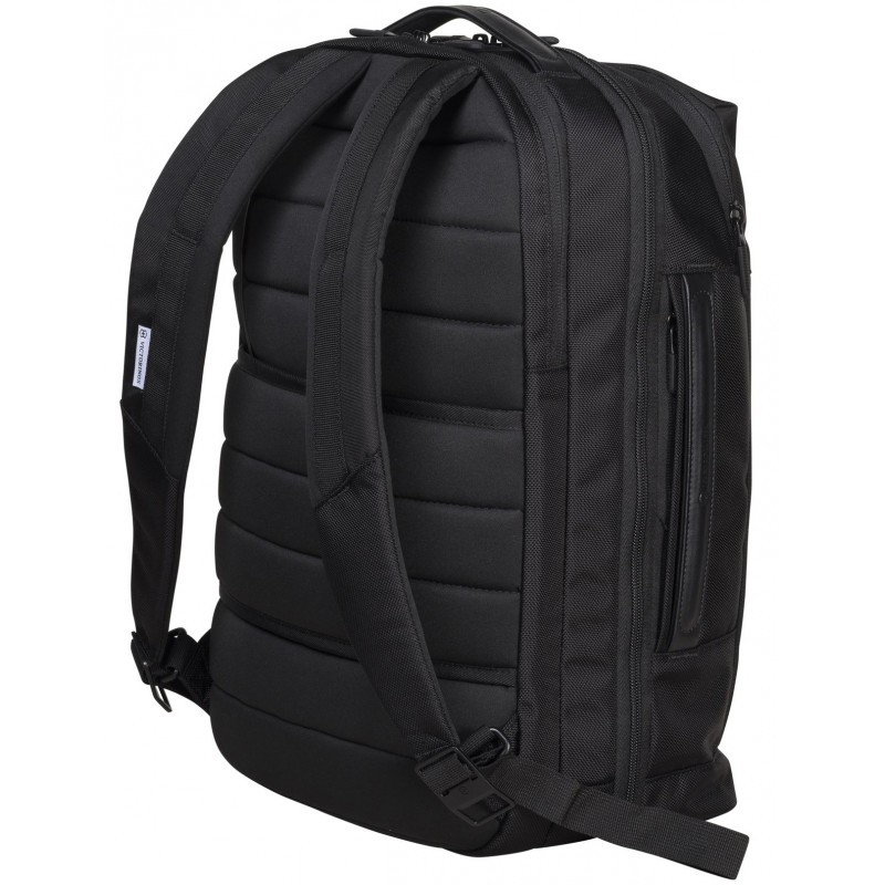 Для максимального комфорта в деловых поездках мягкая спинка оснащена широкой манжетой для фиксации рюкзака на выдвижной багажной ручке.