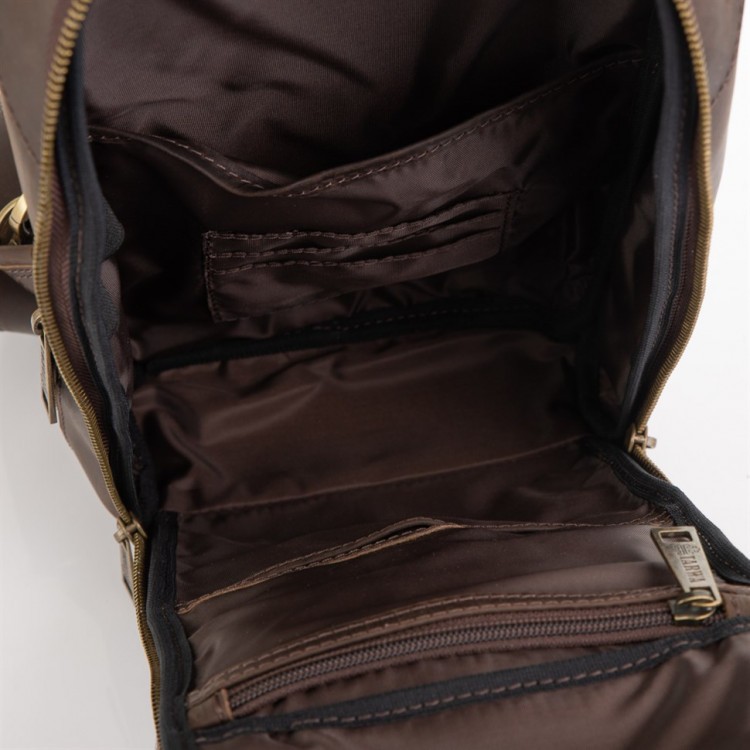 Количество отделений: 1 основное отделение, в котором есть 2 открытых кармана и дополняется врезным карманом на молнии, спереди присутствует 2 объёмных кармана (на молнии), 1 побольше, а другой поменьше, сбоку есть открытый карман с вертикальной молнией, (можно поставить бутылку с водой).