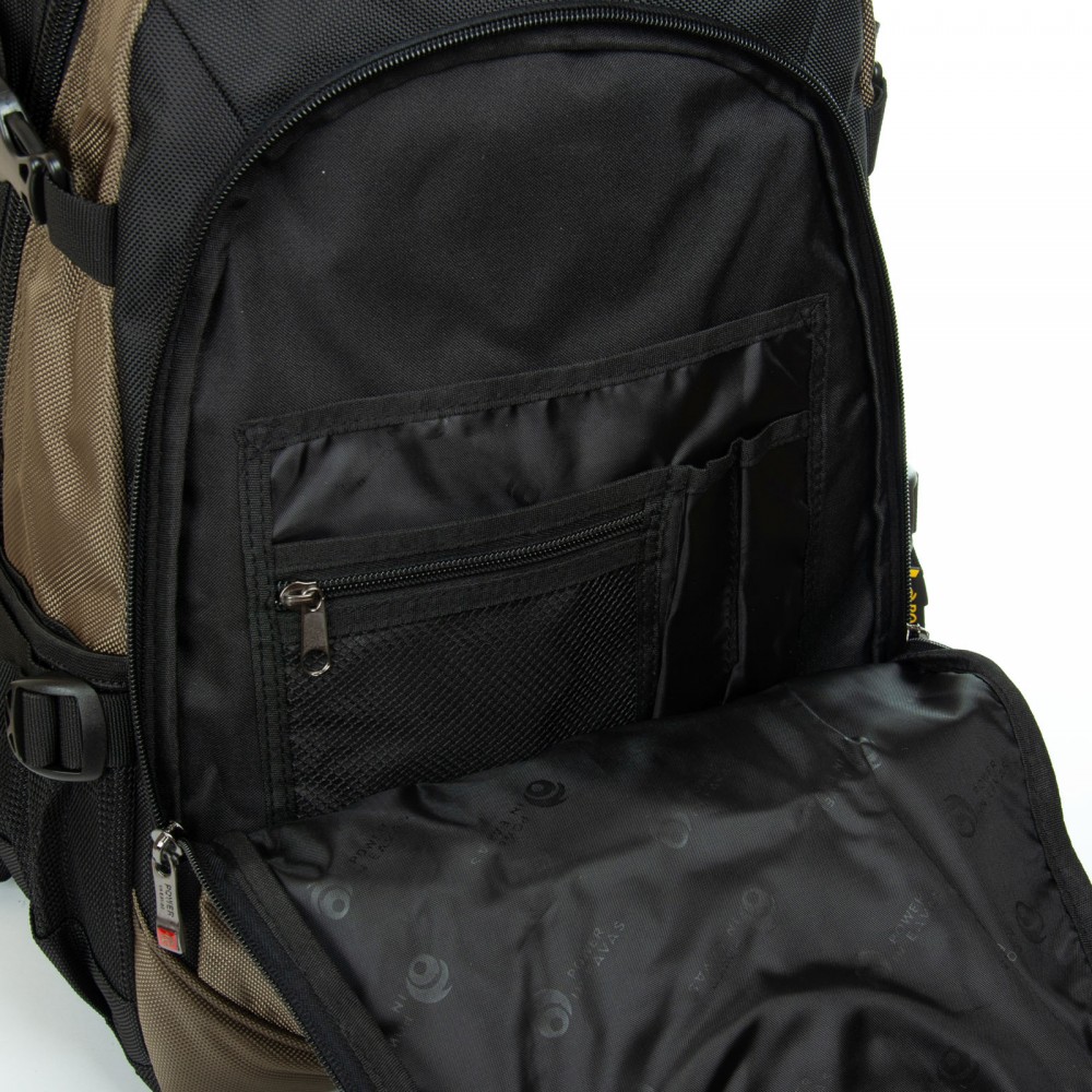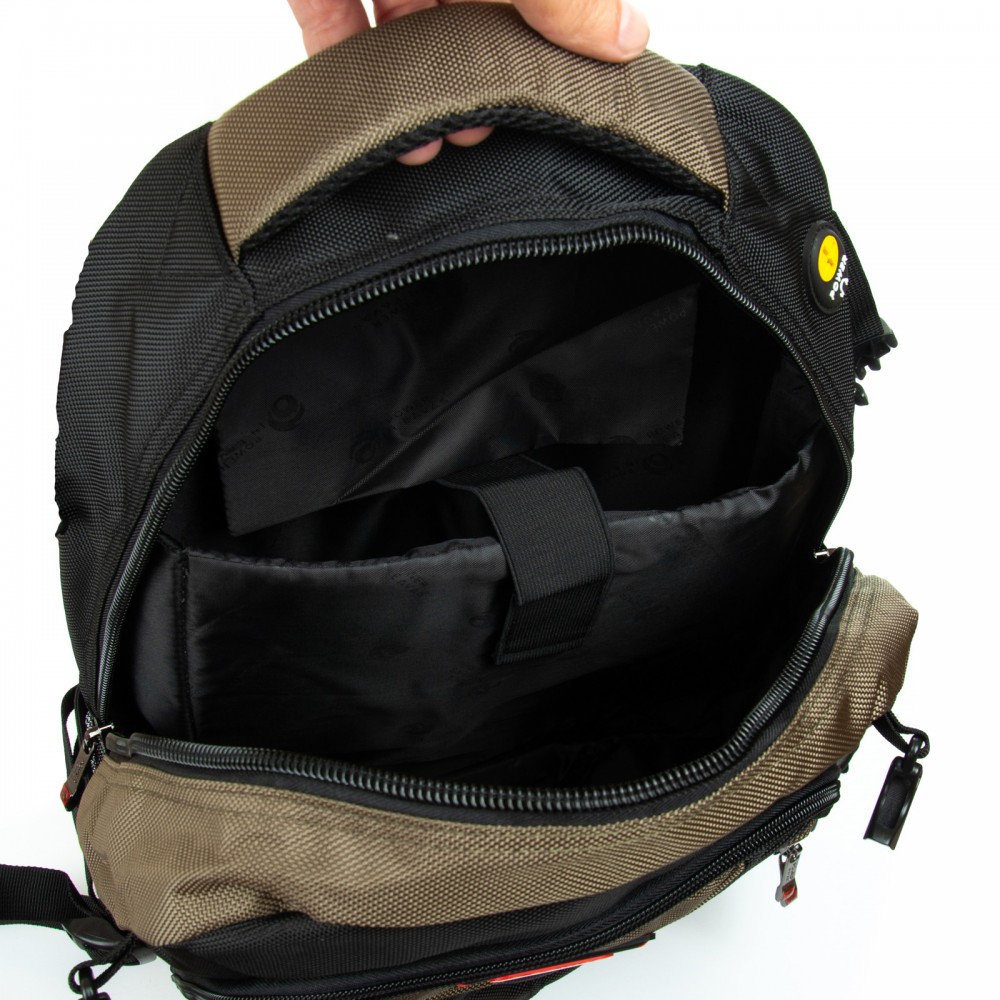 Количество отделений: Внутри рюкзака два отделения на молнии. В первом отделении расположен карман- органайзер, во-втором отделении есть карман для ноутбука и карман для телефона. Снаружи рюкзака на боковых сторонах расположены карманы-сетки для бутылок воды объемом 0,5 литра.