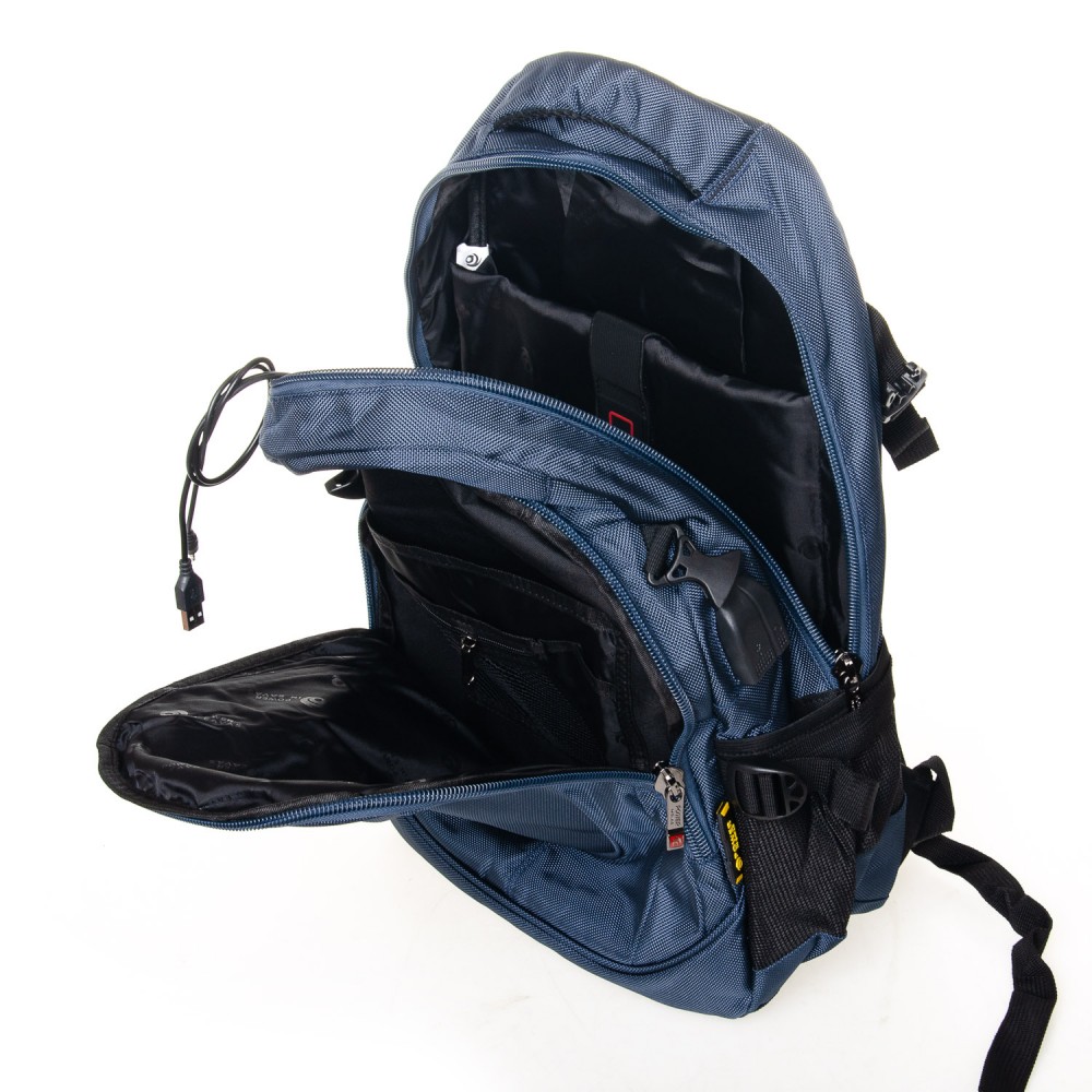 Количество отделений: основное отделение с карманом для ноутбука, подвесным карманом для смартфона. Во втором отделении есть большой карман-органайзер.Также, из второго отделения выведены USB и кабель для наушников на внешнюю стенку рюкзака. На фасаде рюкзака находится карман на молнии. На боковых сторонах рюкзака находятся открытые карманы-сетки.