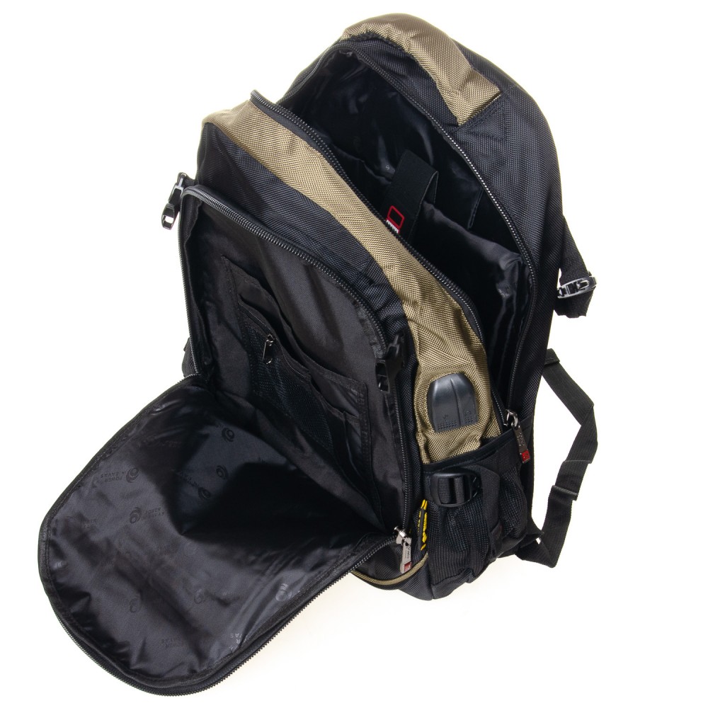 Количество отделений: основное отделение с карманом для ноутбука, подвесным карманом для смартфона. Во втором отделении есть большой карман-органайзер.Также, из второго отделения выведены USB и кабель для наушников на внешнюю стенку рюкзака. На фасаде рюкзака находится карман на молнии. На боковых сторонах рюкзака находятся открытые карманы-сетки.
