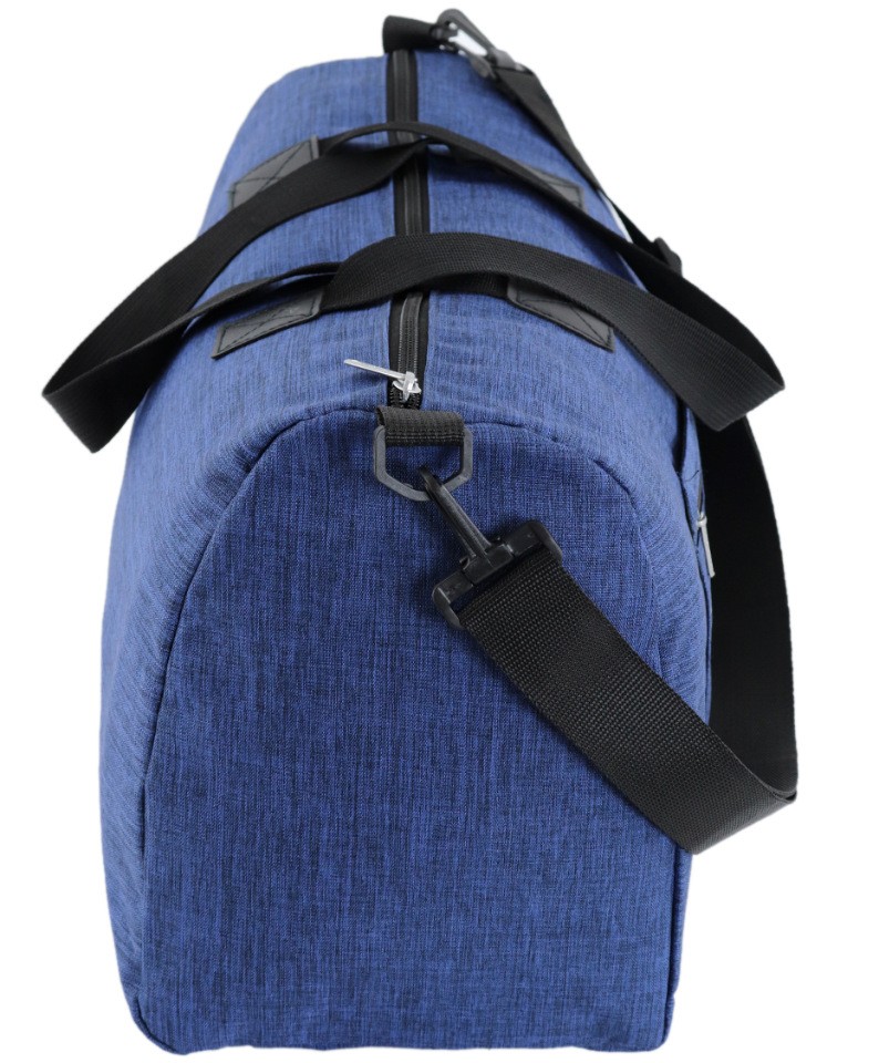 Дорожная складная сумка и папка-органайзер, синего цвета(меланж); на молнии. Корсажные ручки средней длины и съемный плечевой ремень на карабинах. Сумка легко и удобно крепится на выдвигающиеся ручки чемоданов.