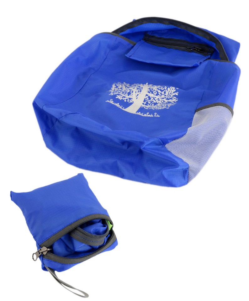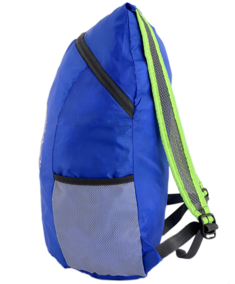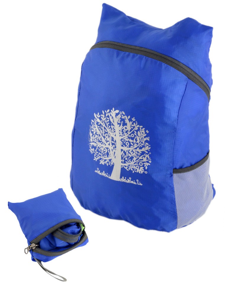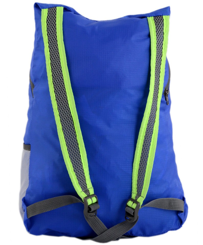 Складной нейлоновый рюкзак синего цвета, с наружным сеточным карманом. Легкий и удобный. Широкие регулируемые по длине лямки.