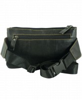 Вместительная кожаная сумка на пояс черного цвета. Имеет 1 основное отделение на молнии. С лицевой стороны 2 кармана: 1 на молнии и 1 на кнопке-магните, с тыльной- 1 на молнии. Прочный регулируемый корсажный ремень.