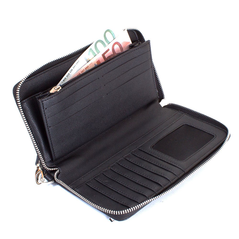 Количество отделов: одно основное отделение. Внутри 17 кармашков для визиток, банковских и дисконтных карт, 3 горизонтальных накладных кармана, карман для пропусков, фотокарт и мелких документов (с прозрачным окошком), 2 отделения для купюр, разграниченные карманом-перегородкой на молнии. На внешней стороне есть прорезной карман на молнии