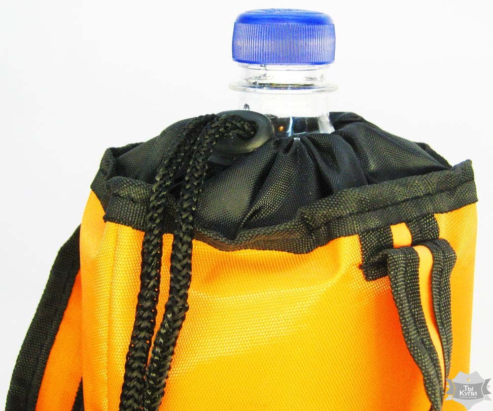 - Фиксируется бутылка при помощи шнура с пластиковым фиксатором
