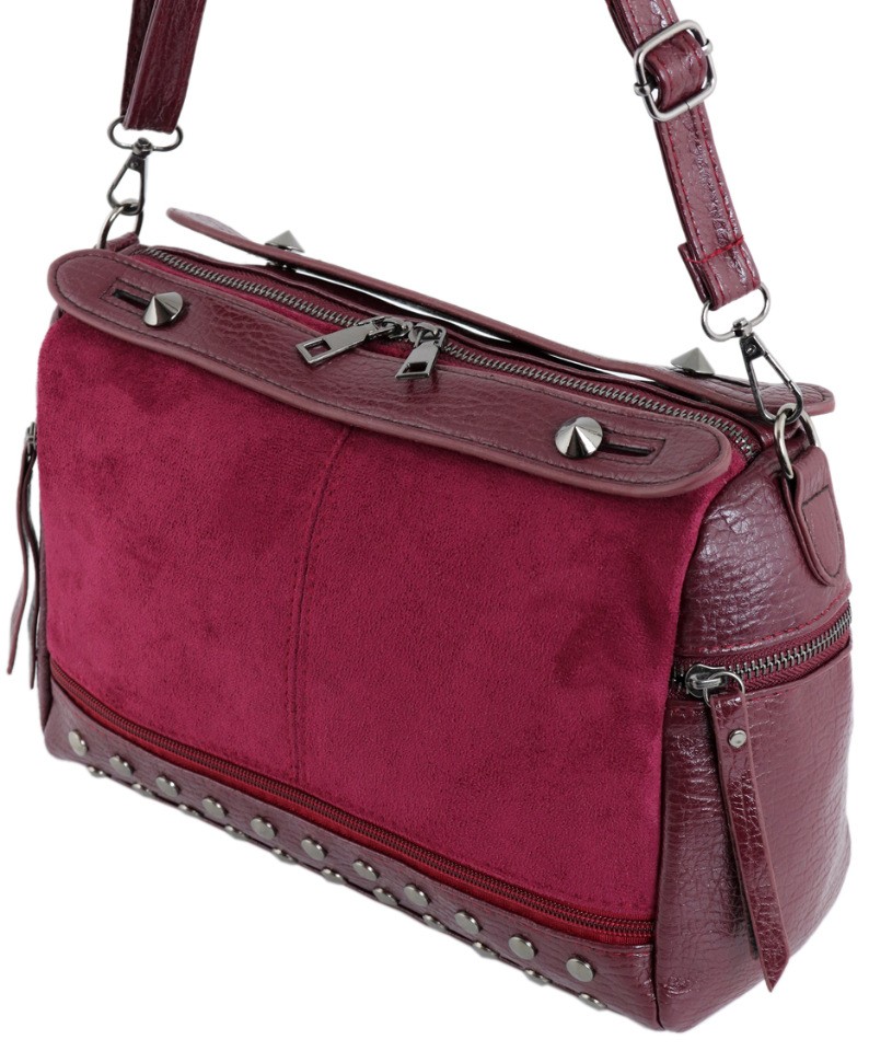 Сумка из мягкой искусственной кожи бордового цвета, с лицевой стороны- искусственный замш. Закрывается на молнию, внутри: 3 кармашка, 1- на молнии. С тыльной стороны и боковые карманы- на молнии. Короткие ручки и ремешок на карабинах.