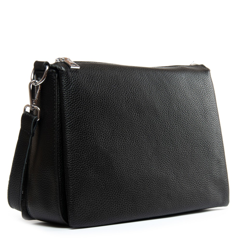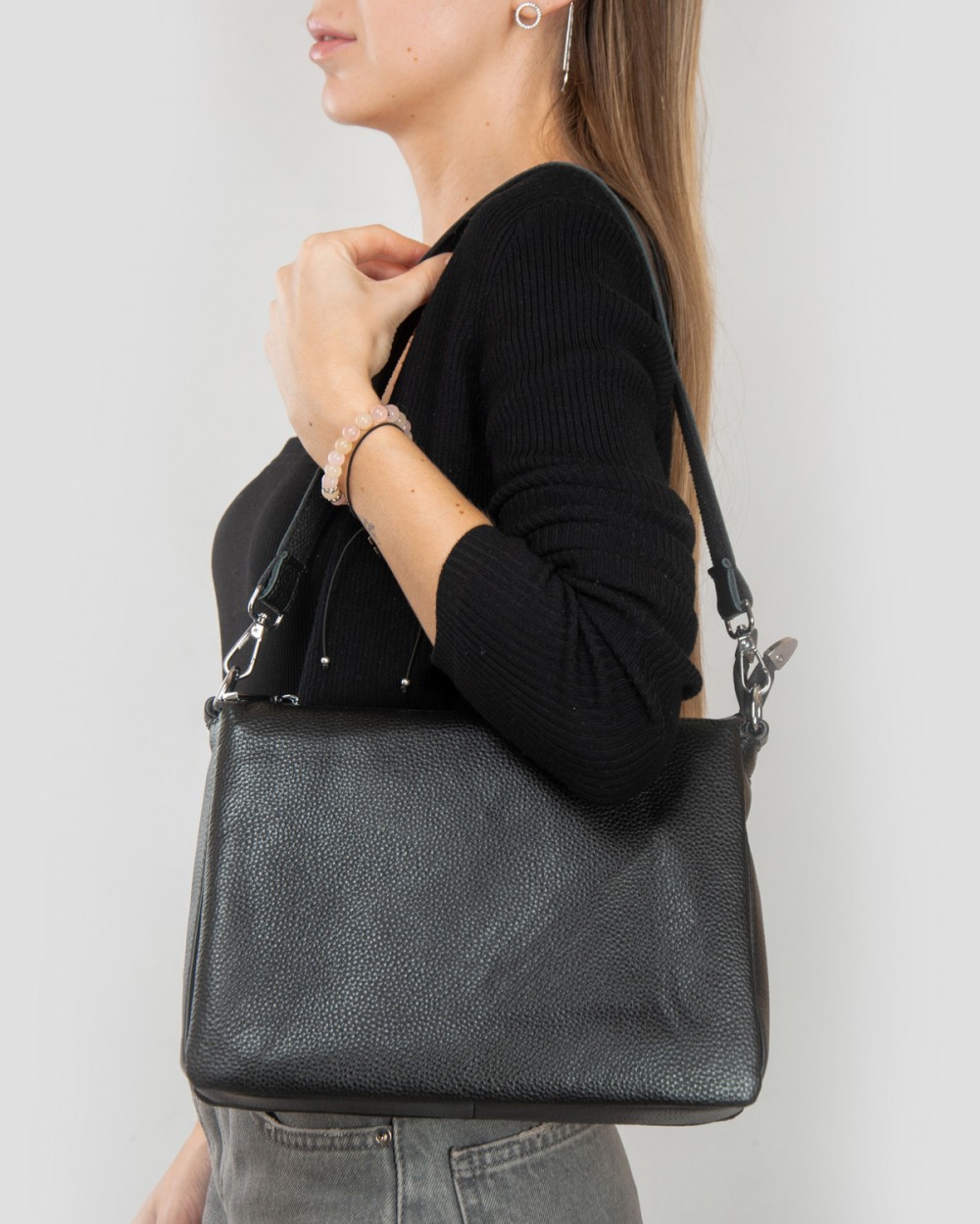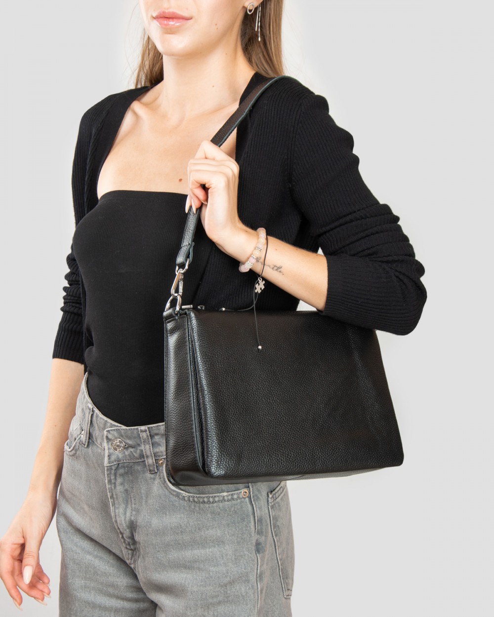 Количество отделов: Внутри находятся три отделения разделенные карманом-перегородкой. Среднее отделение дополнительно закрывается на молнию и внутри находится боковой открытый карман и карман на молнии. Снаружи сумки на обратной стороне расположен карман на молнии.