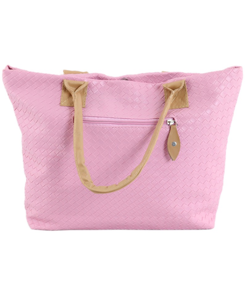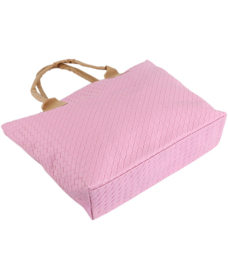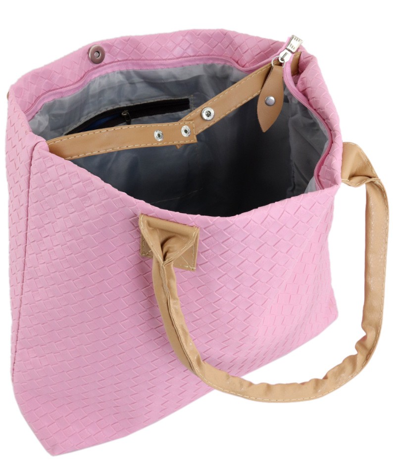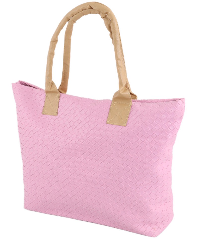 Сумка-шоппер с тиснением- имитация плетения, розового цвета. Закрывается на молнию и кнопку-магнит, внутри- 1 кармашек. С тыльной стороны- карман на молнии. Ручки средней длины.