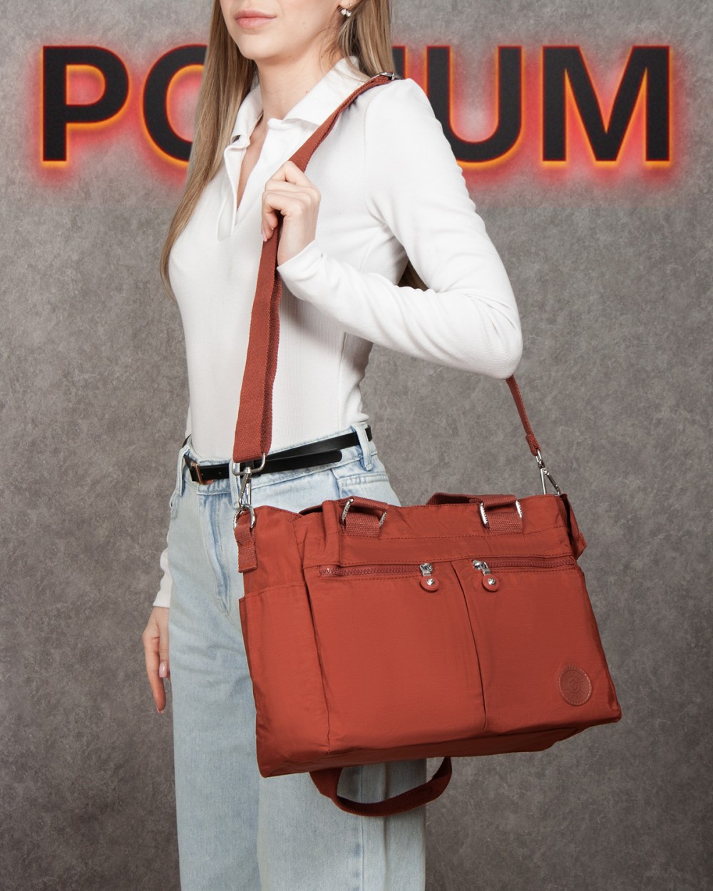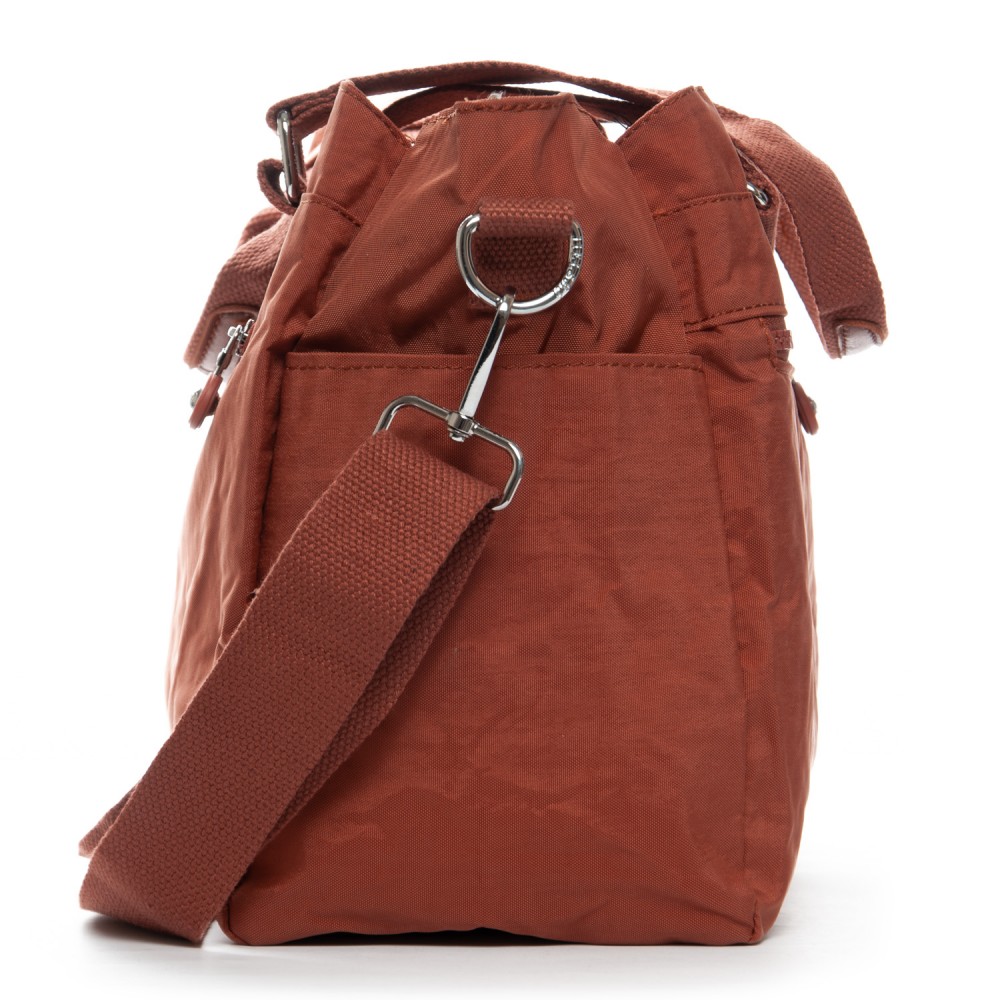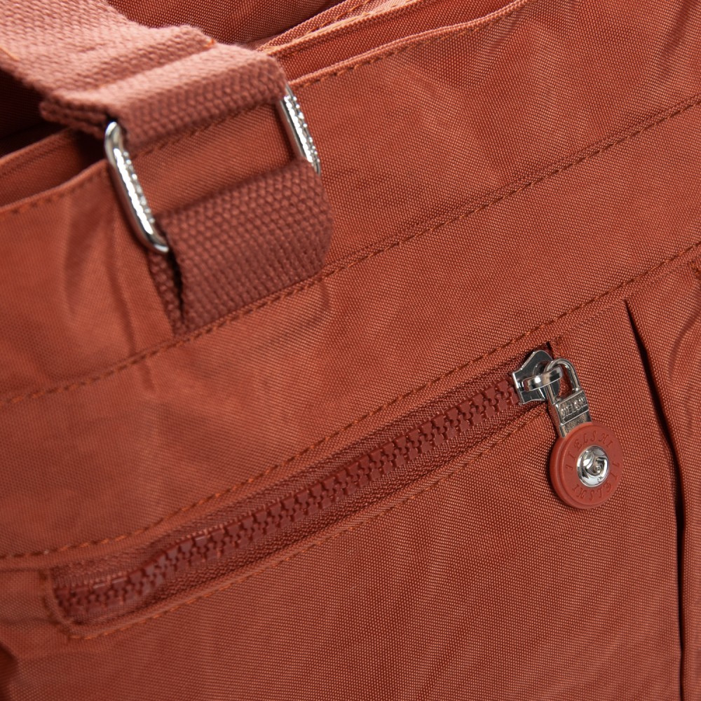 Три отделения: центральное закрывается на молнию, а боковые на магнитную кнопку. Внутри центрального отделения находятся большой боковой карман на молнии и открытый двойной карман. На фасаде и обратной стороне сумки находятся карманы на молнии. А на торцах есть открытые небольшие карманы.