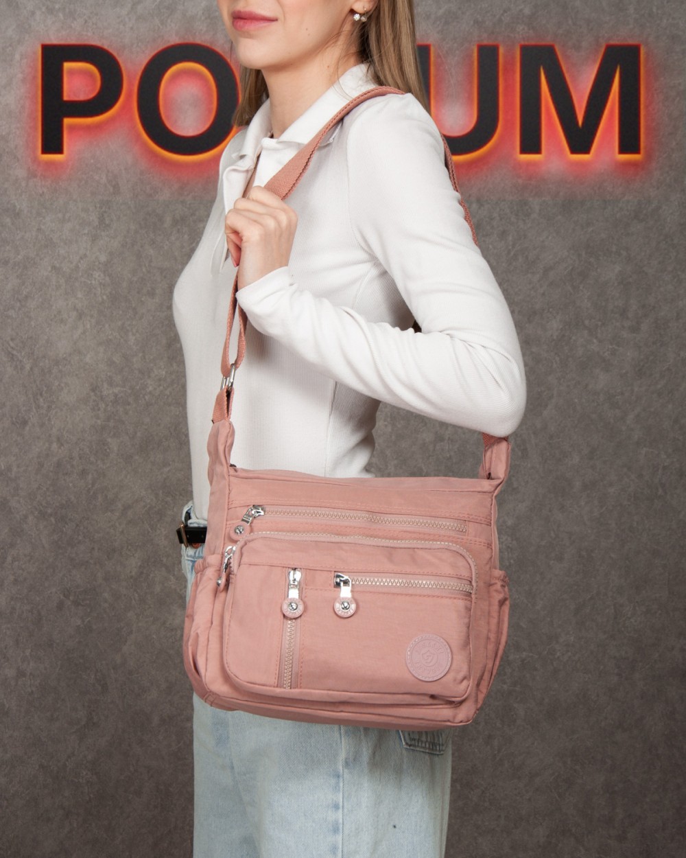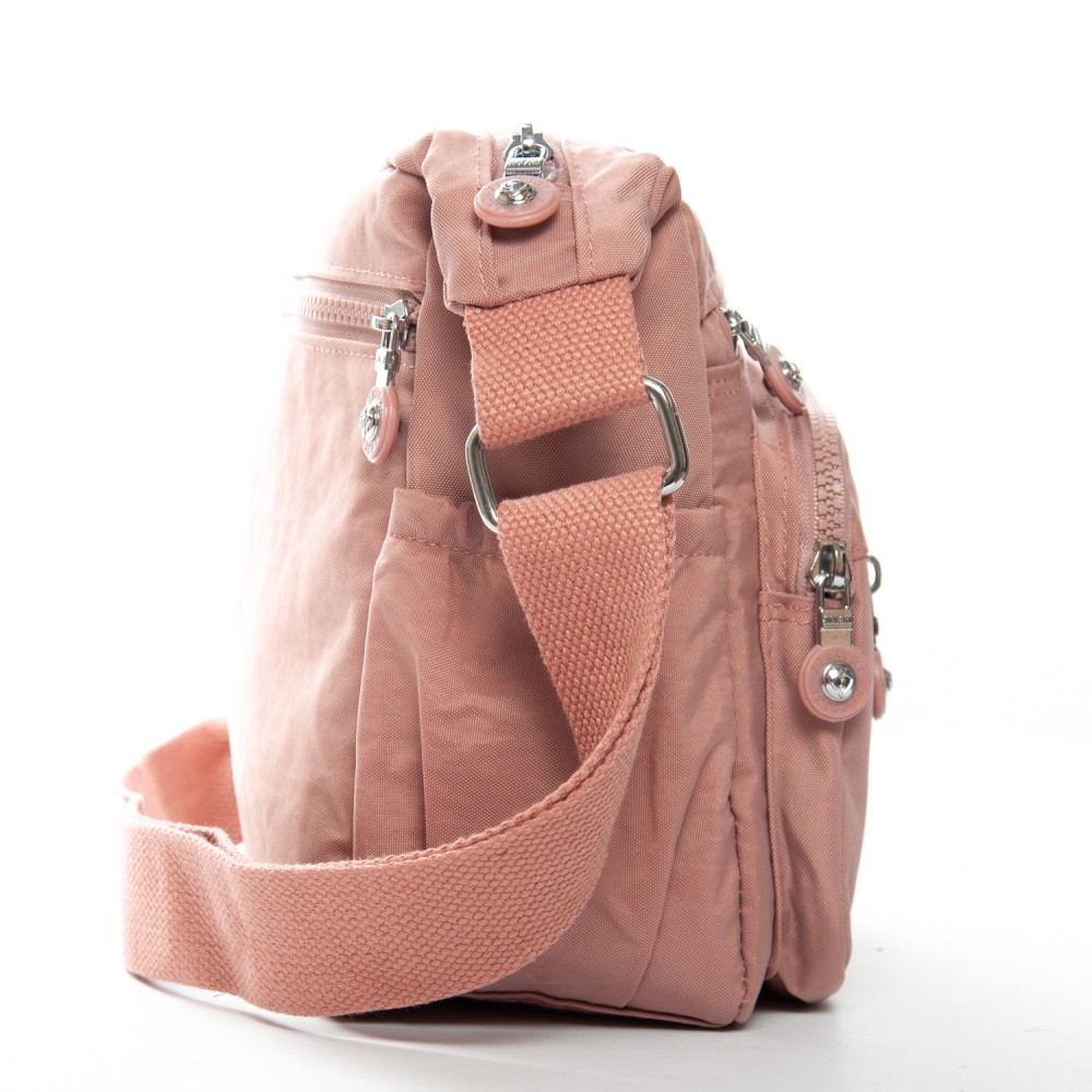 основное и дополнительное отделения, разделенные карманом-перегородкой на молнии и большой боковой карман на молнии. На фасаде находятся четыре кармана на молнии, а на обратной стороне один карман. На торцах сумки есть небольшие открытые карманы