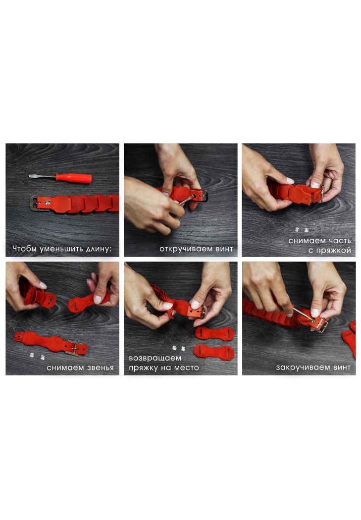 - С помощью съемной пряжки, можно регулировать длину ремня, убрав необходимое количество звеньев