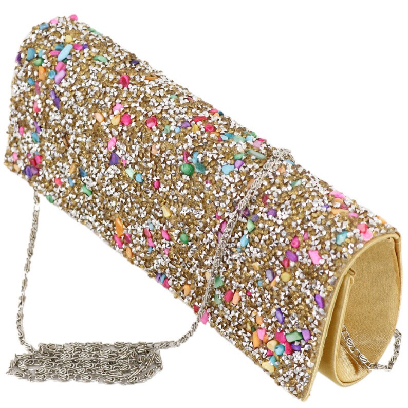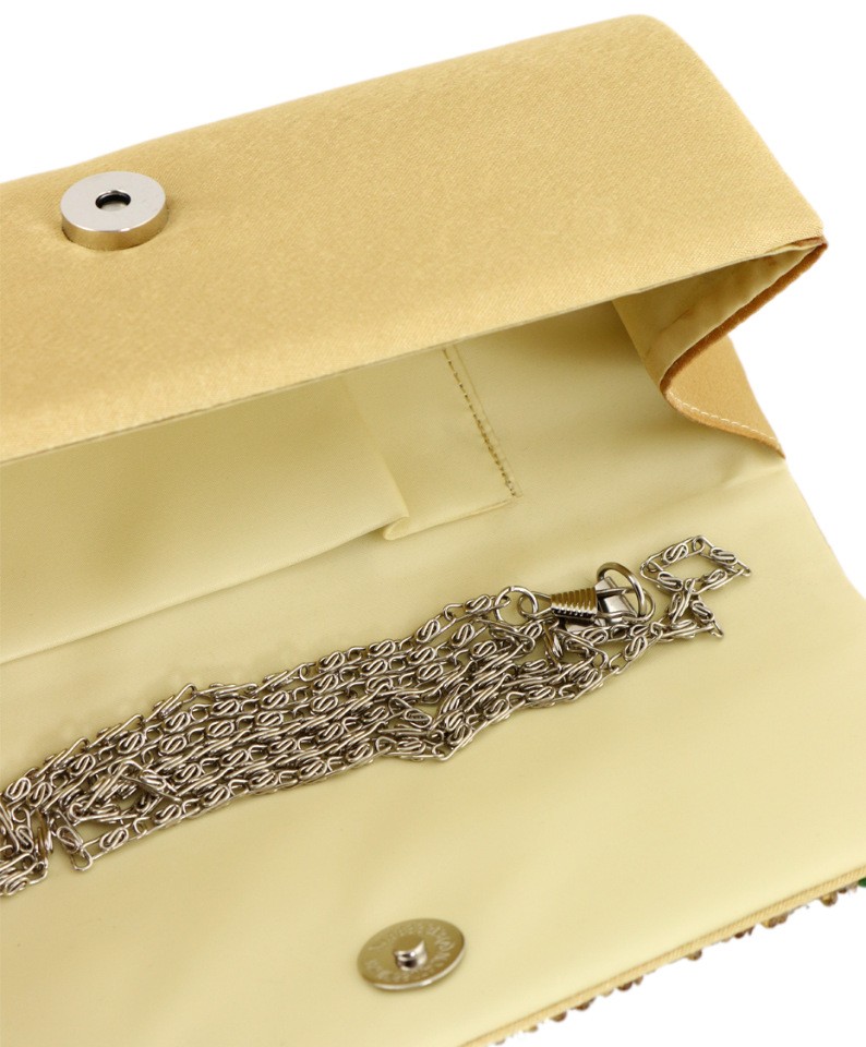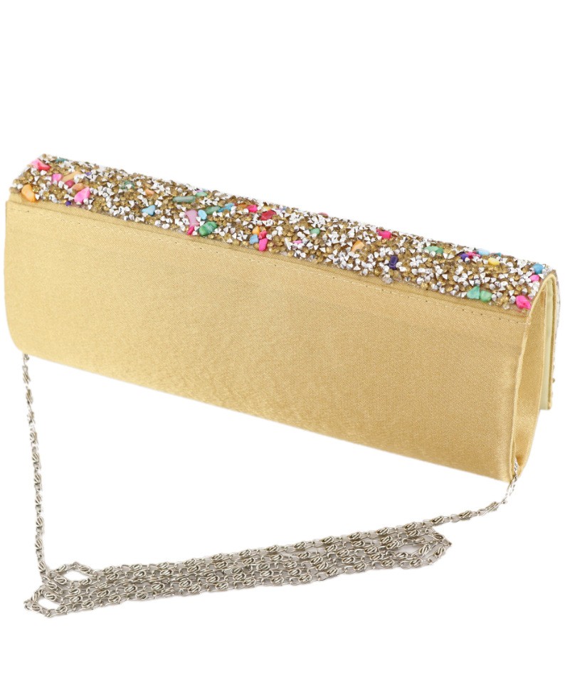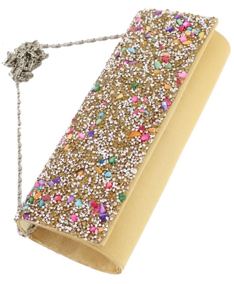 Вечерний клатч золотого цвета, имеет жесткий каркас. Лицевая сторона полностью декорирована стразами и натуральным перламутром. Закрывается клапаном на кнопку-магнит. Съемная металлическая цепочка на карабинах.