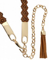 Тонкий пояс коричневого цвета, вся поверхность перфорирована. Металлическая застежка- крючок и цепочка с кисточкой.