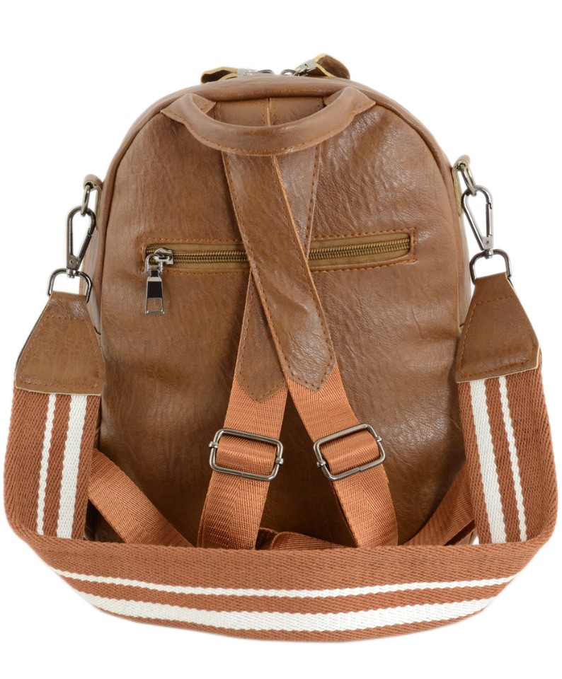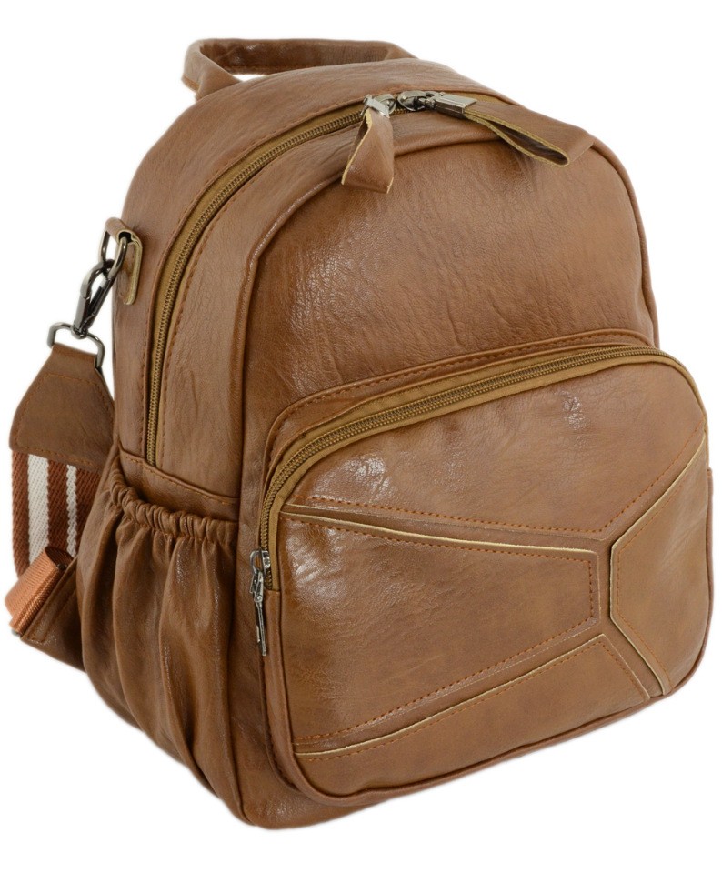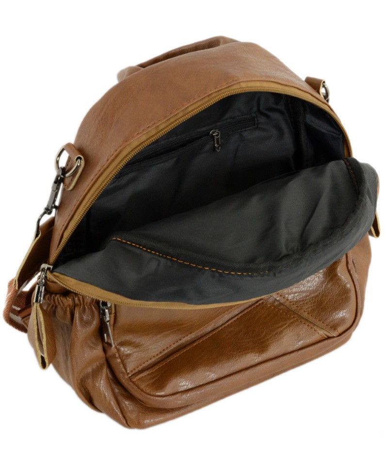 Рюкзак-сумка из искусственной кожи коричневого цвета, на молнии. Внутри: 3 кармашка, 1- на молнии. С лицевой стороны- объемный накладной карман на молнии; боковые карманы. С тыльной- врезной на молнии. Плечевые лямки и корсажная широкая ручка на карабинах.