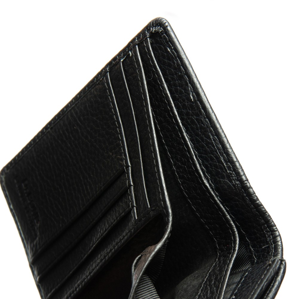 Внутри находятся два больших открытых отделения для банкнот (разделены кожаной перегородкой), 4 больших кармана и 5 карманов для визитных карт, один из которых выполнен прозрачным. Снаружи кошелька на обратной стороне есть двойная монетница на молнии.
